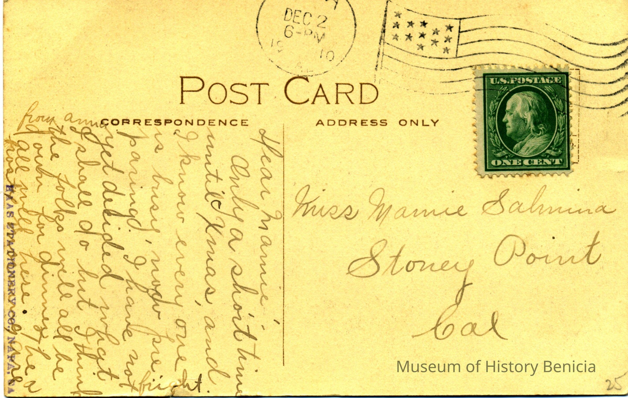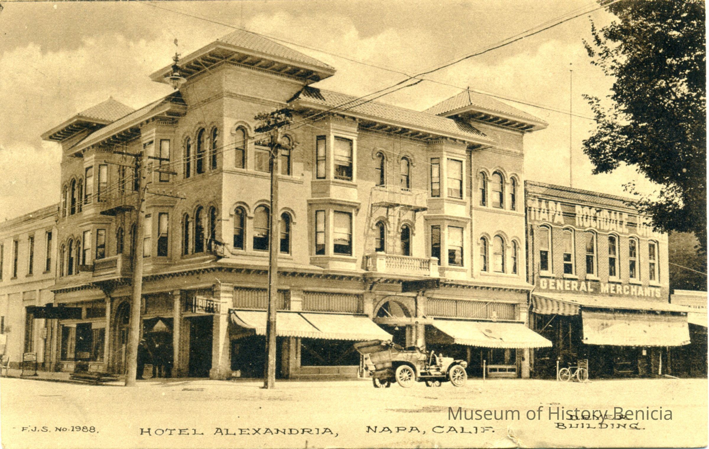 This is a divided back postcard of the Hotel Alexandria in Napa, CA. It is published by Frank J. Stumm of Benicia. The back is addressed to Miss Marmmie Salvina of Stoney Point, CA. The message just talks about Christmas plans.Collection