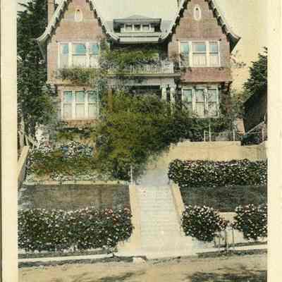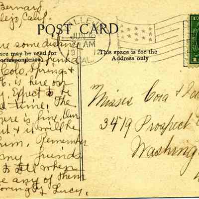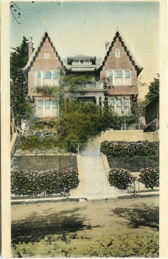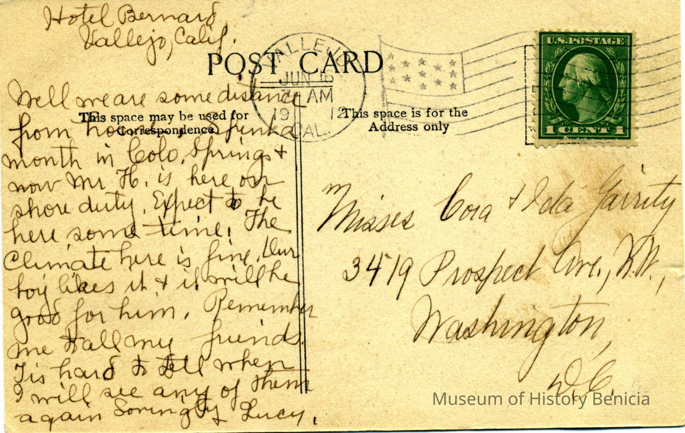 This is a colorized divided back postcard of a home in Vallejo, CA. It is published by Frank J. Stumm of Benicia. The back is addressed to Misses Cora & Iola Gairity of Washington D.C.. The message is telling friends at home where they are and just saying "HI". At the top they say they are at the Hotel Bernard in Vallejo, CA.