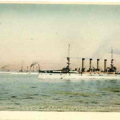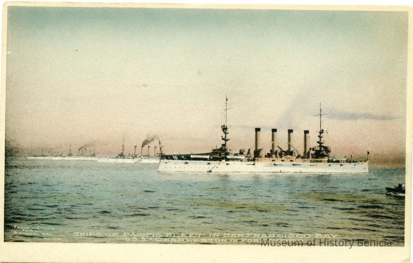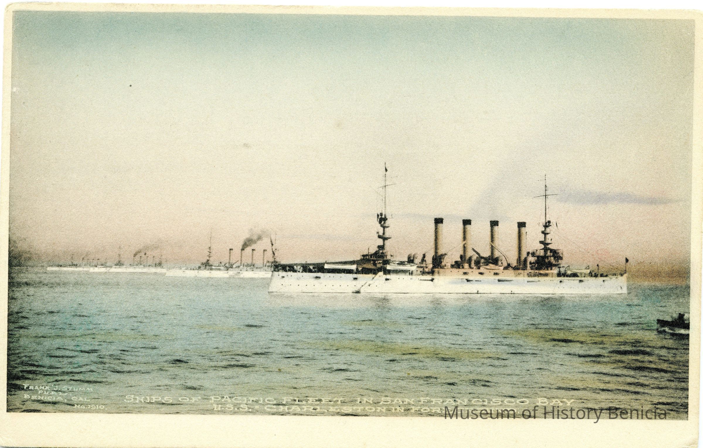 This is a colorized divided back postcard of ships of the Pacific Fleet in San Francisco Bay. The U.S.S. Charleston is in the foreground. It is published by Frank J. Stumm of Benicia. The back is blank.Collection