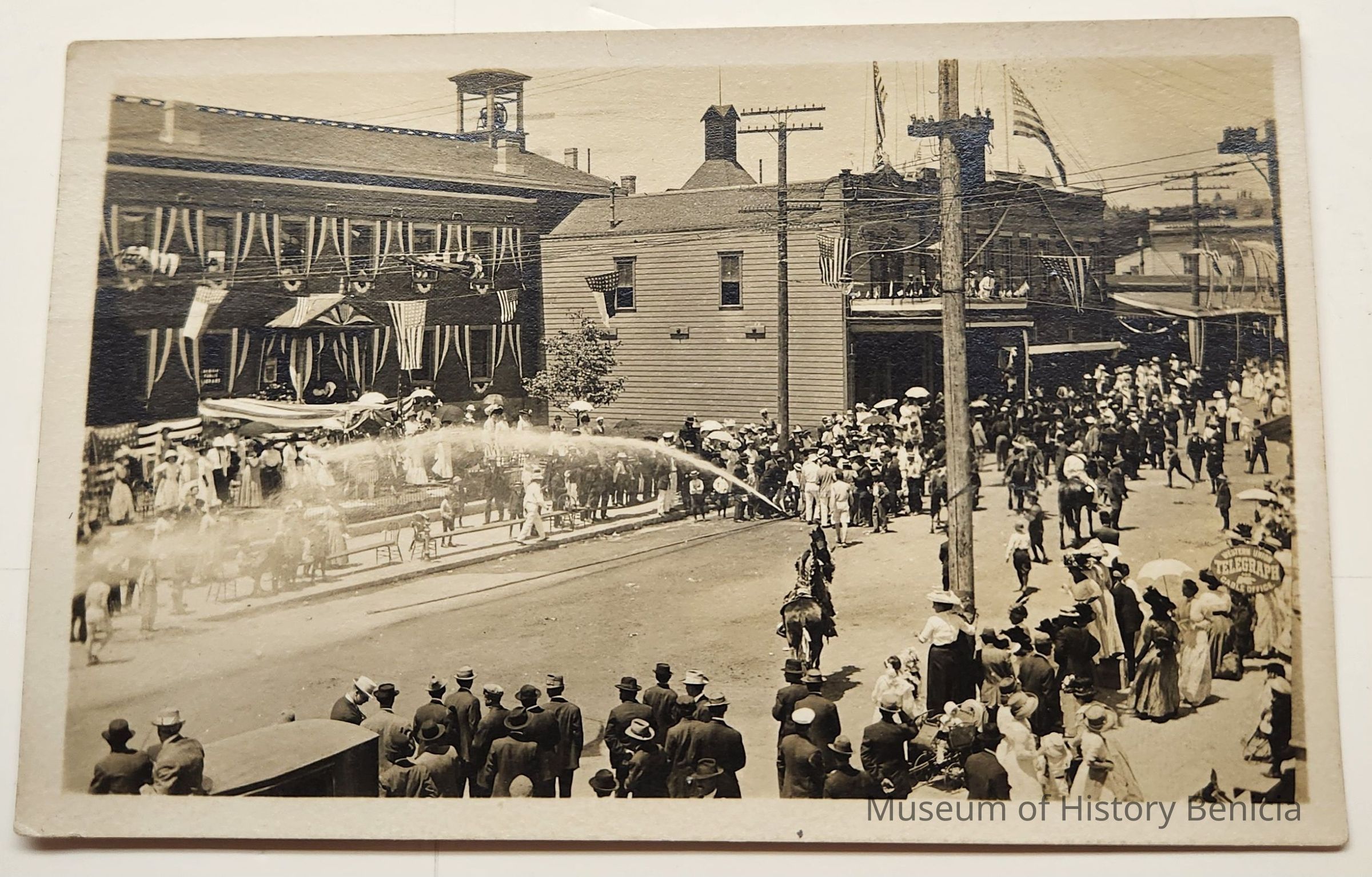 B/W postcard depicting a display of water pumping by the fire department in front of the Capitol Building on First Street, Benicia. The card was sent to Mrs. Marjorie Elmore by her Dad [Emerson Stoner] with a six cents stamp.Collection