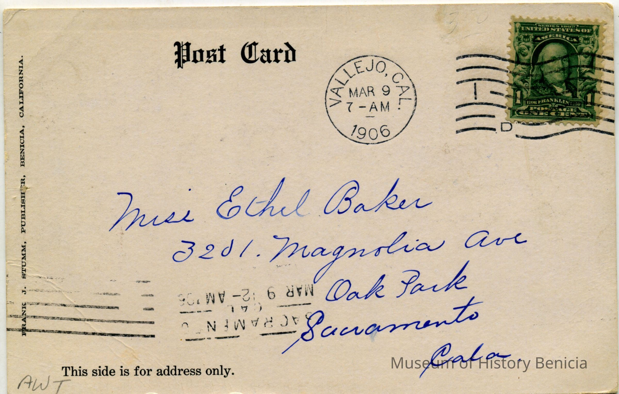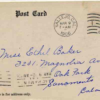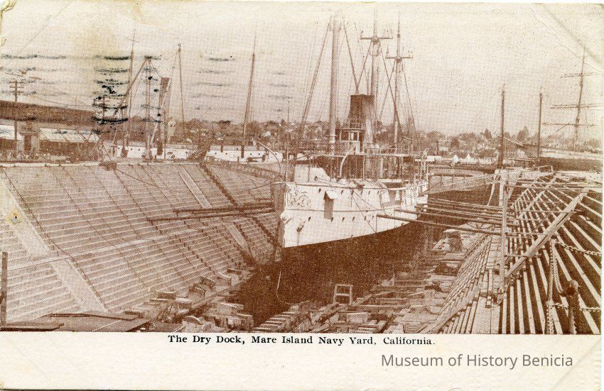 This is an undivided back postcard. The photo is of the Dry Dock at Mare Island in Vallejo CA. It was published by Frank J. Stumm of Benicia. The back is addressed to Miss Ethel Baker of Sacramento, CACollection