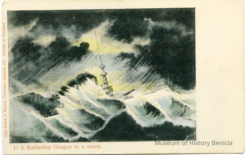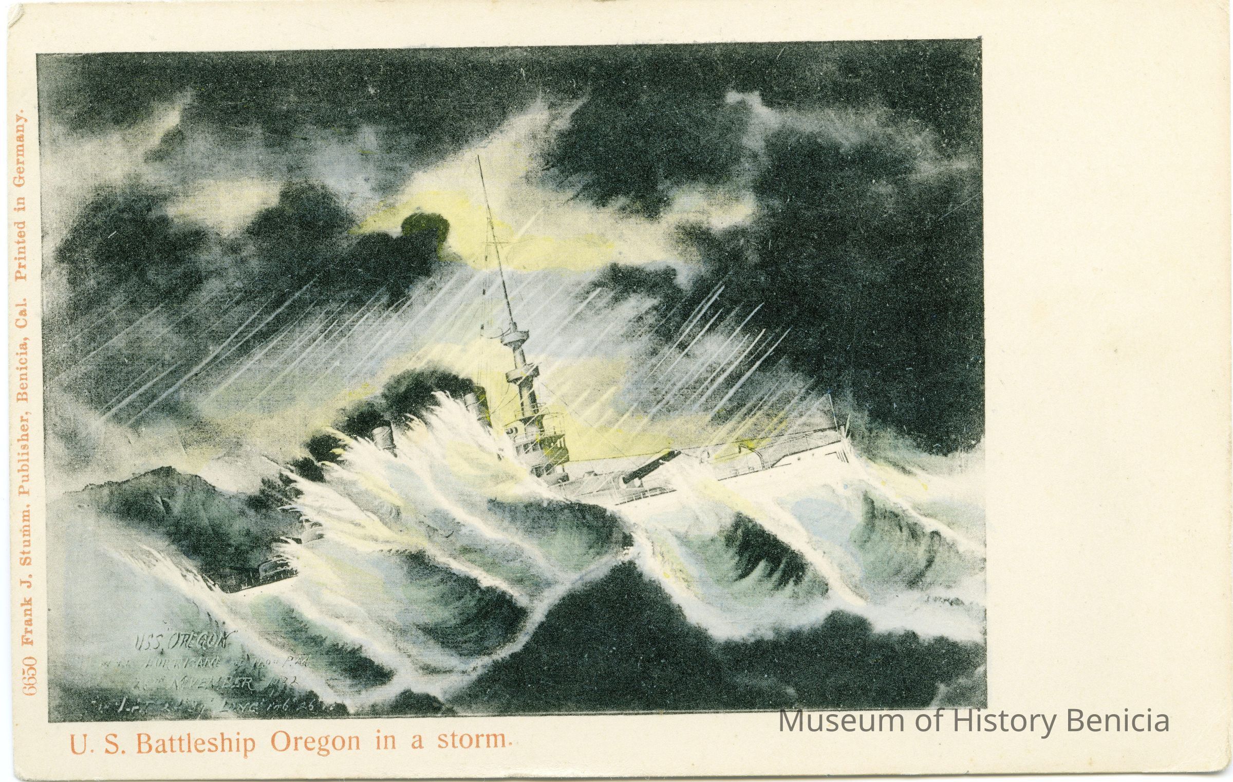This is an undivided back postcard. The photo is of the U.S. Battleship Oregon in a storm. It was published by Frank J. Stumm of Benicia. It was printed in Germany. The back is blank.