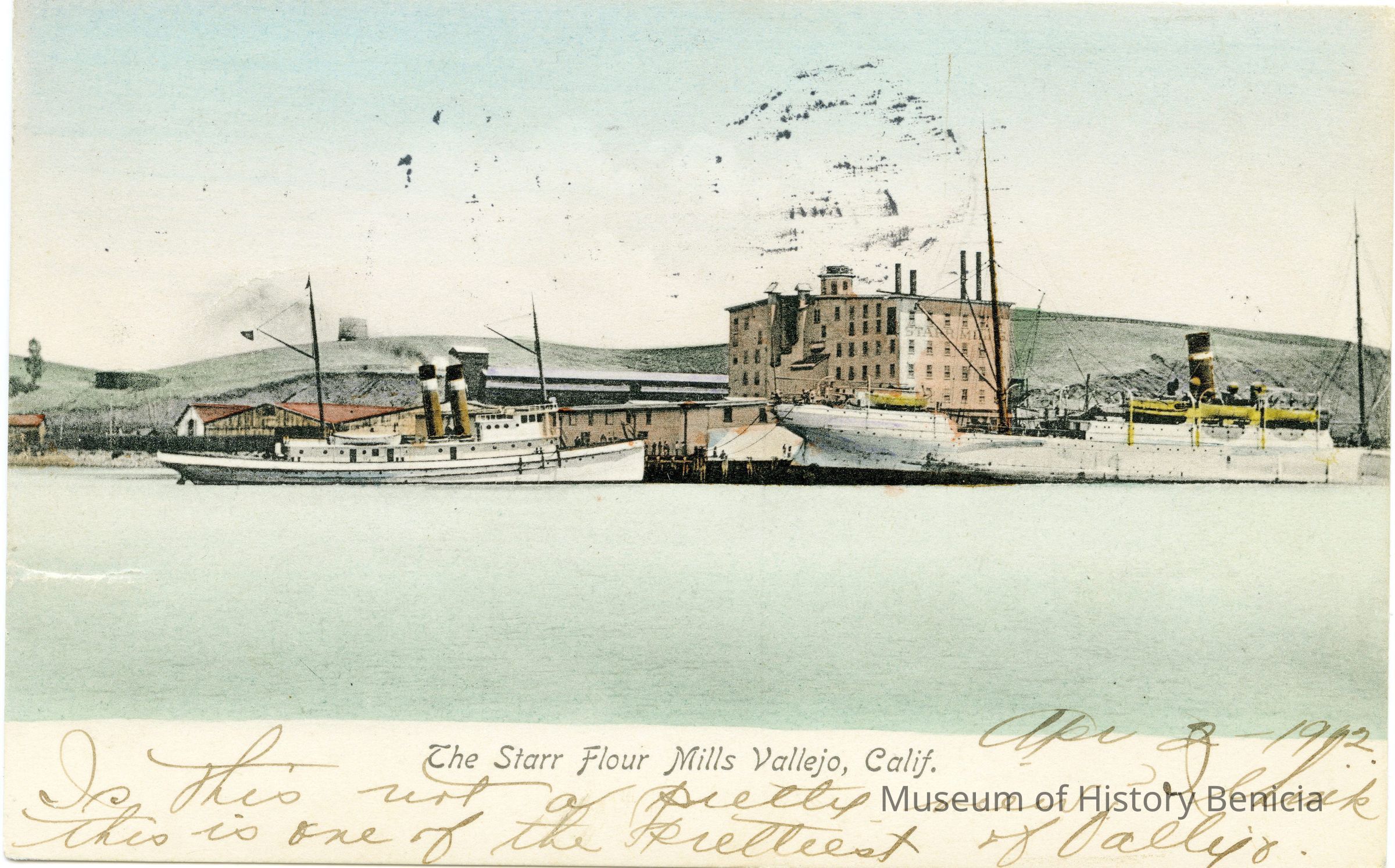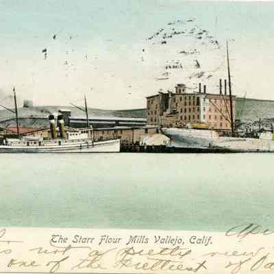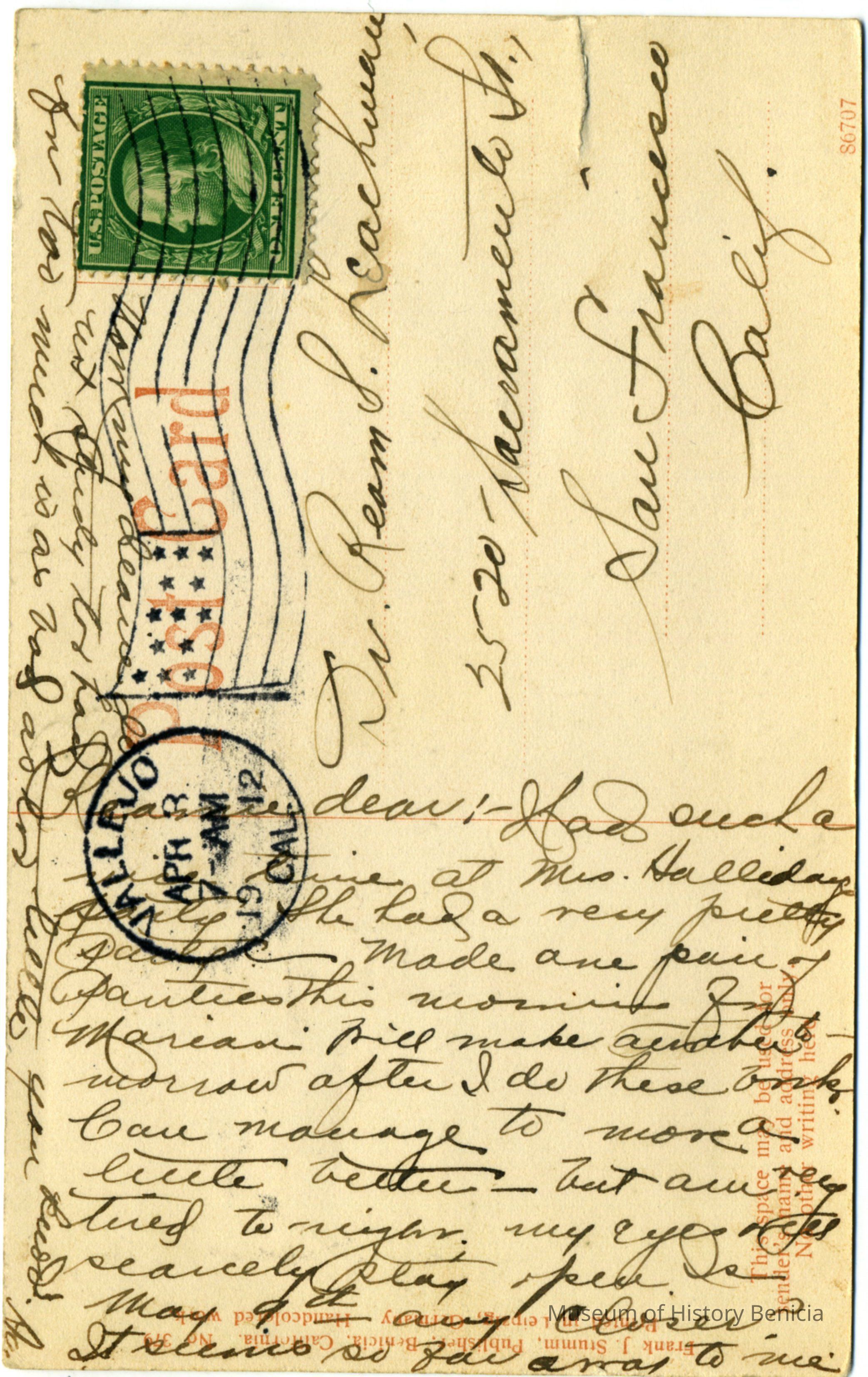 This is a divided back postcard but the back is only for the addressee and the sender's address. In this case the back has been used for part of the message. Since the card was mailed in 1912 when it was legal to write on the back, this may be an old postcard that is just now being used. The photo is of the Starr Flour Mills in Vallejo, CA.. It was published by Frank J. Stumm of Benicia. The back is addressed to Dr. Ream S. Leachwau of San Francisco, CA. The message concerns making panties(?).Collection