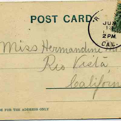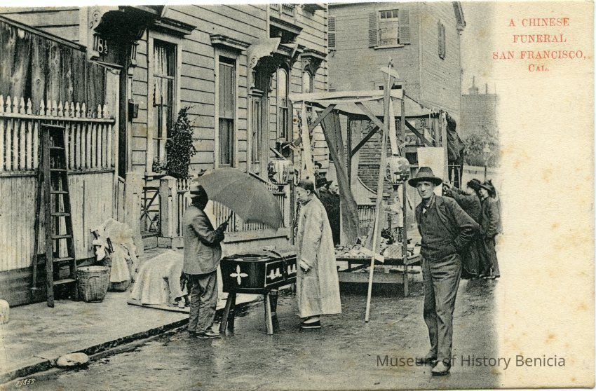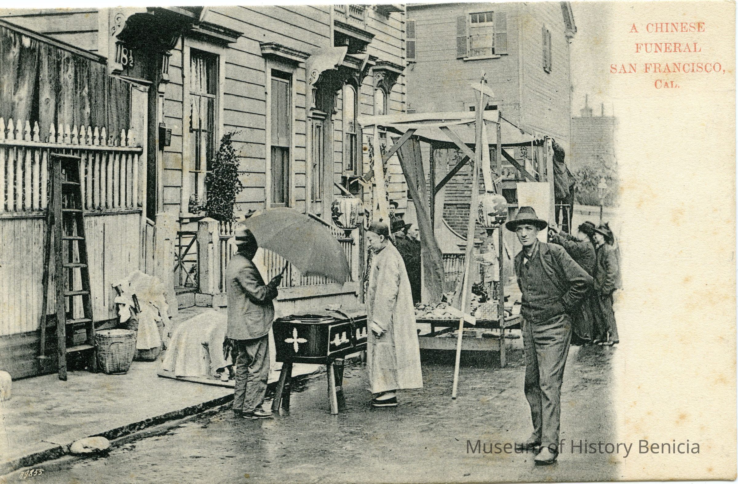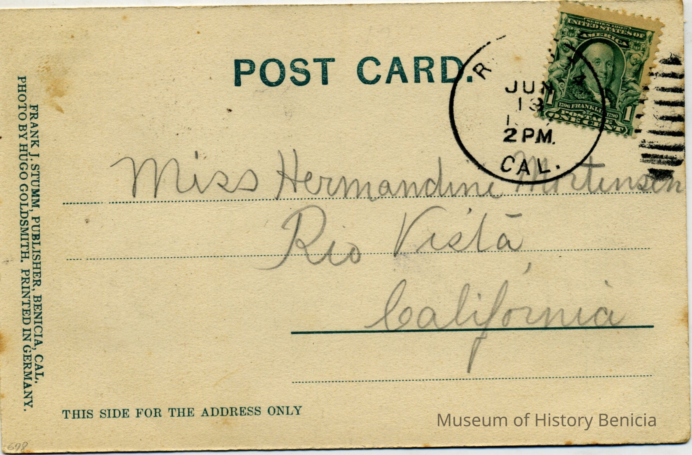 This is an undivided back postcard. The photo is of a Chinese funeral in San Francisco, CA. It was published by Frank J. Stumm of Benicia. The back is addressed to Miss Hermandine Martinsen of Rio Vista, CA. The back says the photo was by Hugo Goldsmith.