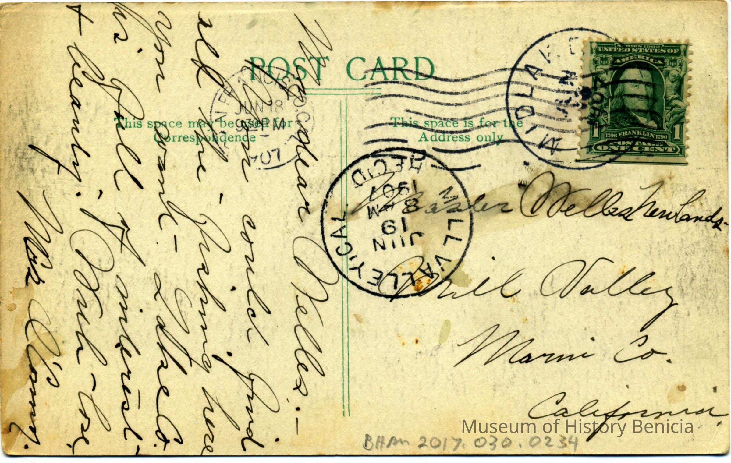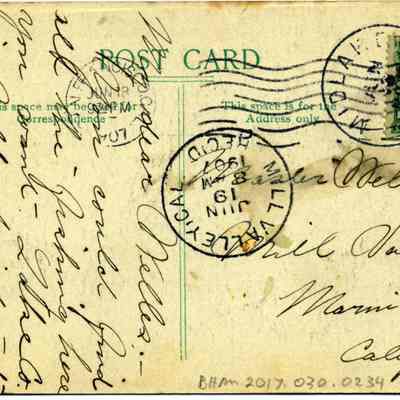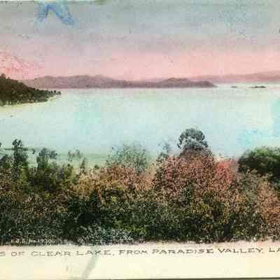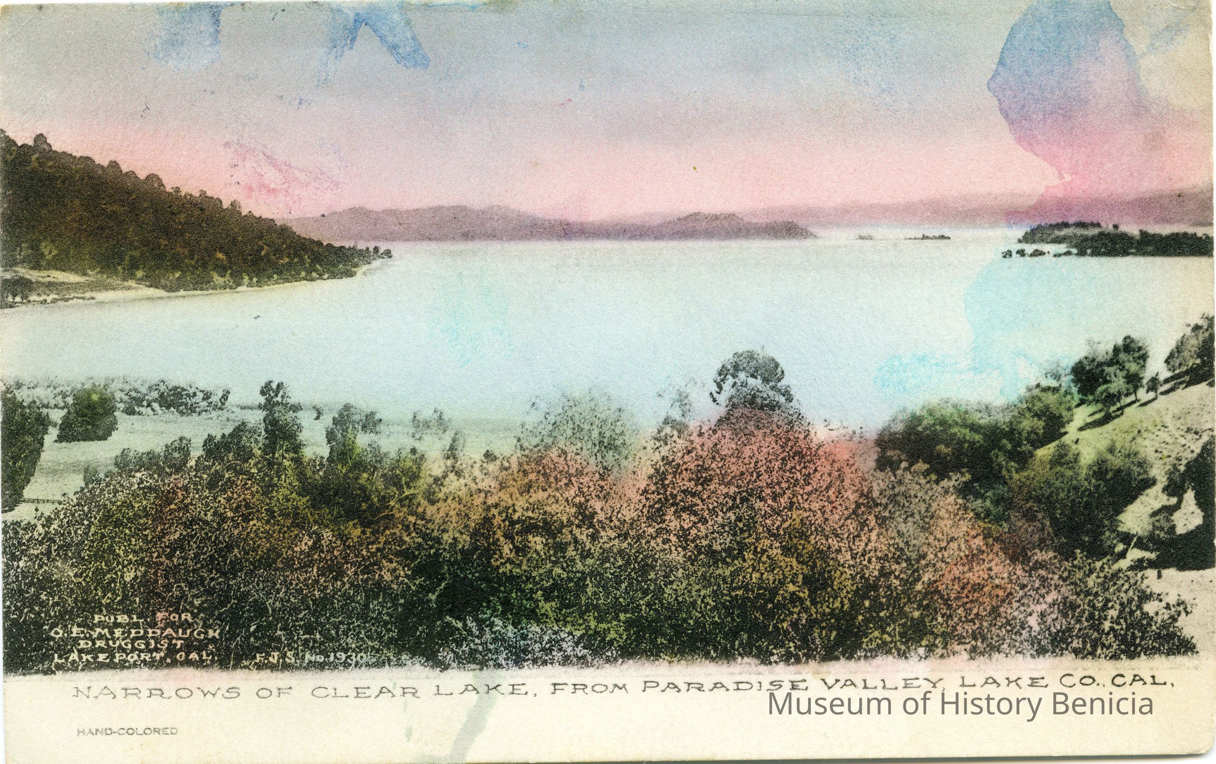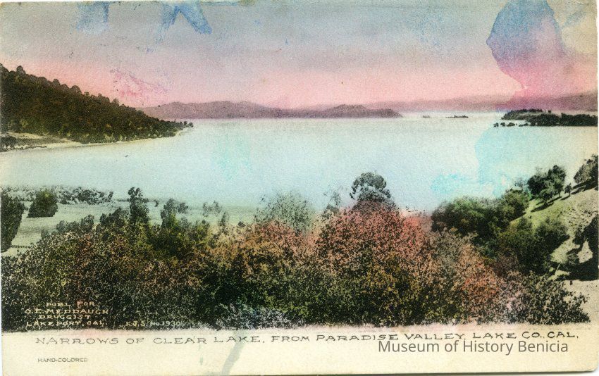 This is a divided back postcard. The photo is of Clear Lake from Paradise Valley in Lake County CA. The card is published by Frank J. Stumm of Benicia, CA for O. E. Meddaugh a druggist in Lakeport, CA. The back is addressed to Master Welles Newland of Mill Valley, CA. The message is telling about the beauty and fishing in Lake County.Collection