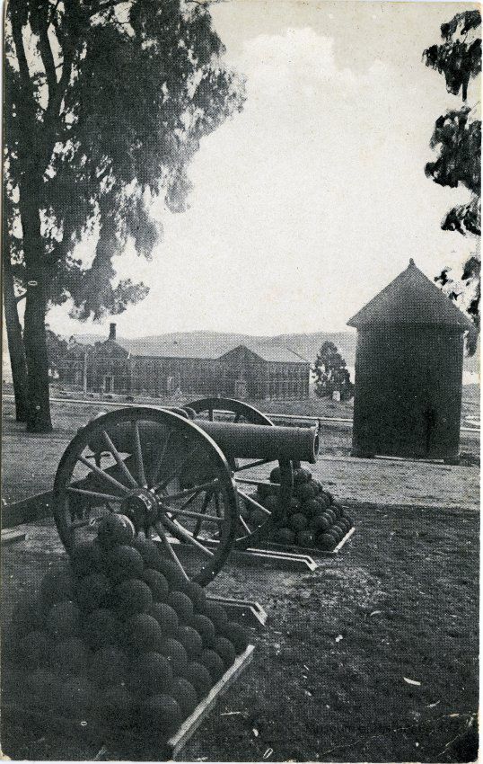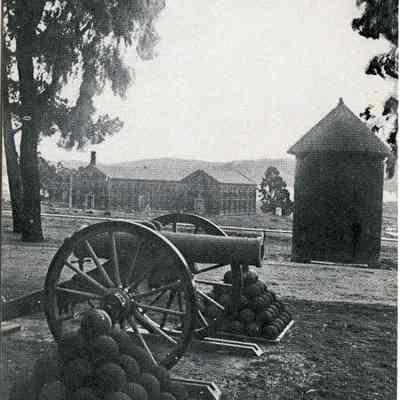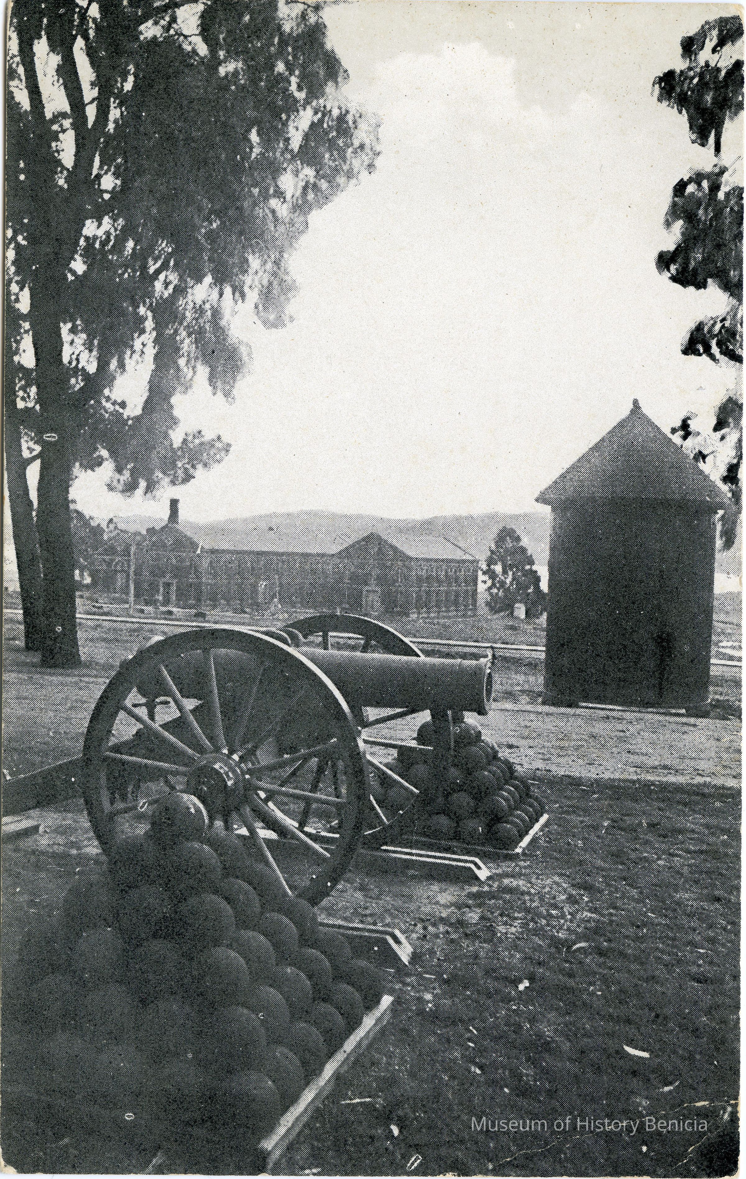 This is a divided back postcard. The photo is of buildings and a cannon at the Arsenal in Benicia. The back is blank. It does show the publisher as Cardinell - Vincent Co. of San Francisco.Collection