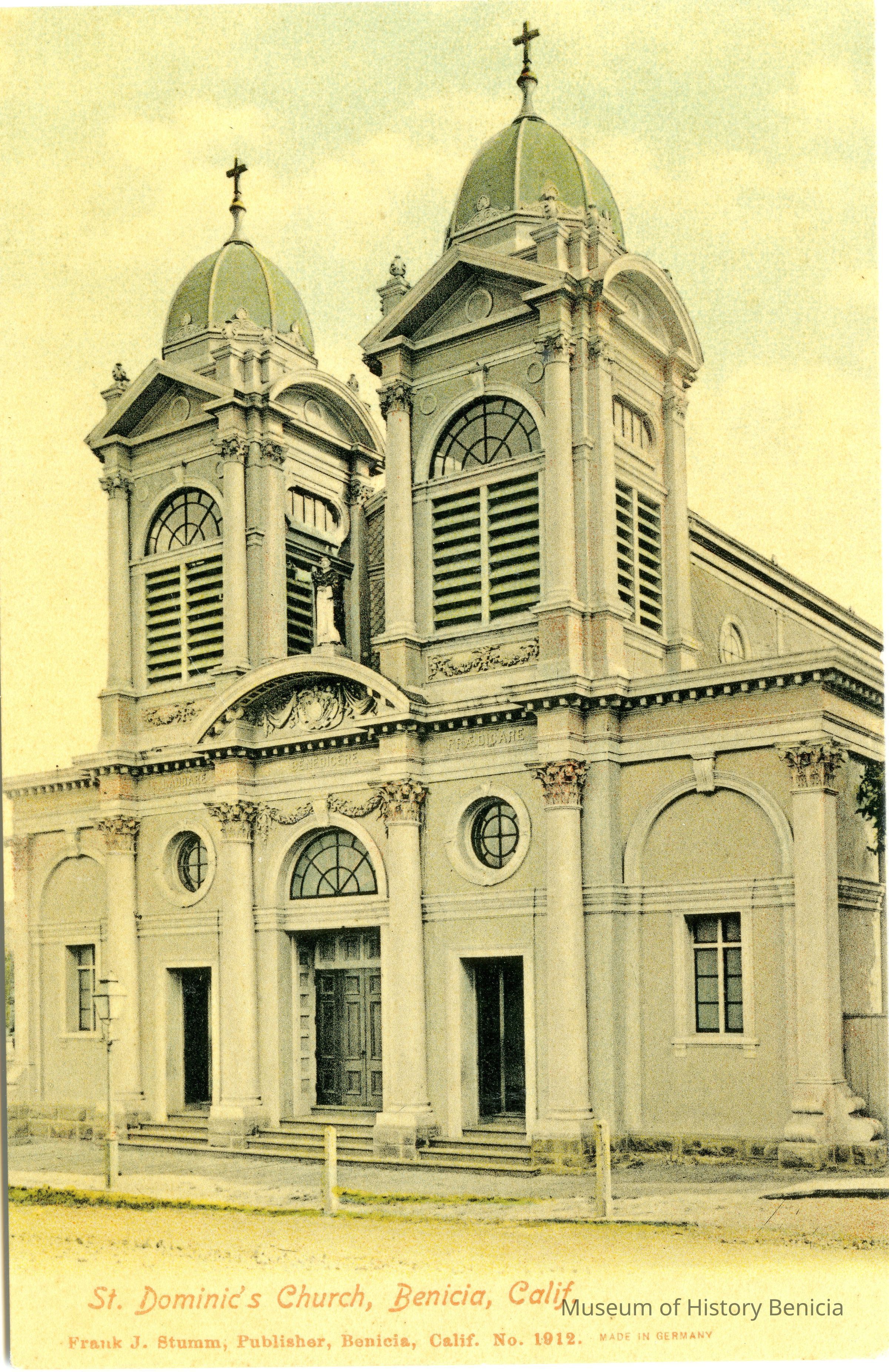 This is a divided back colorized postcard. The photo is of St. Dominic's church in Benicia. The card was published by Frank J. Stumm of Benicia, CA. The back is blank.Collection