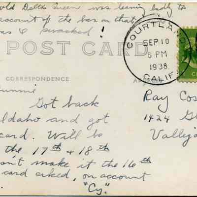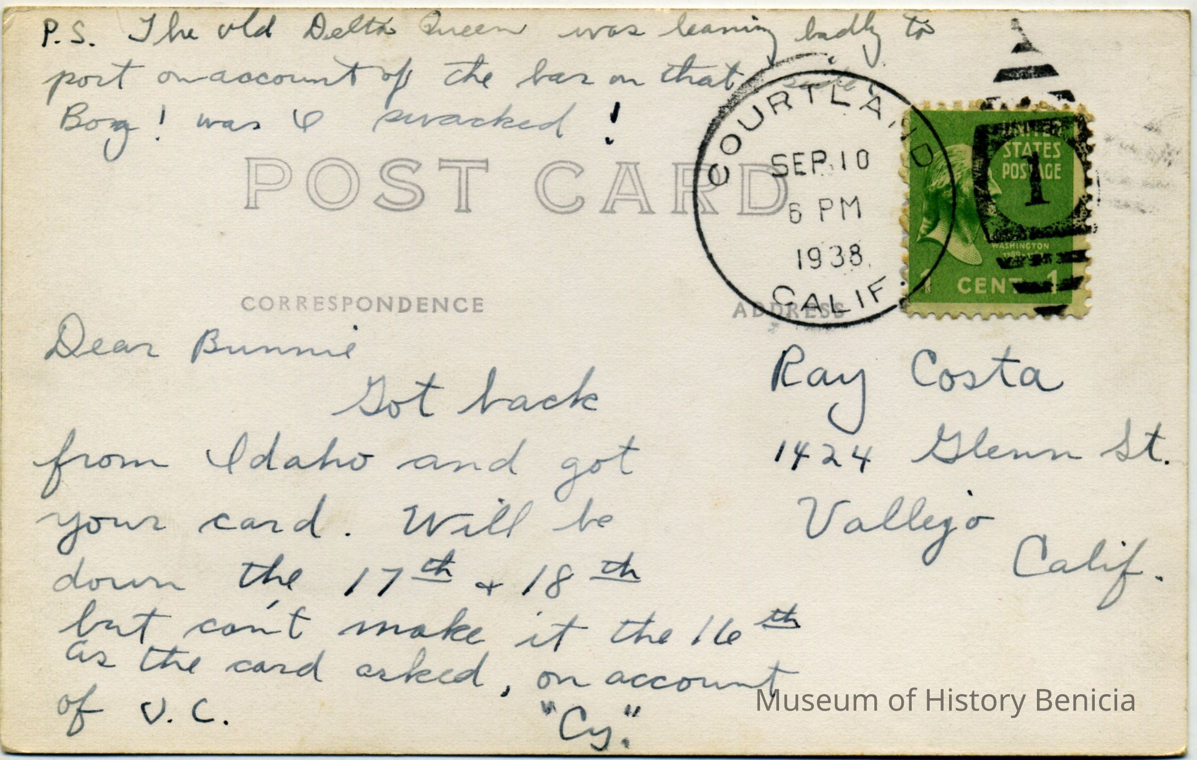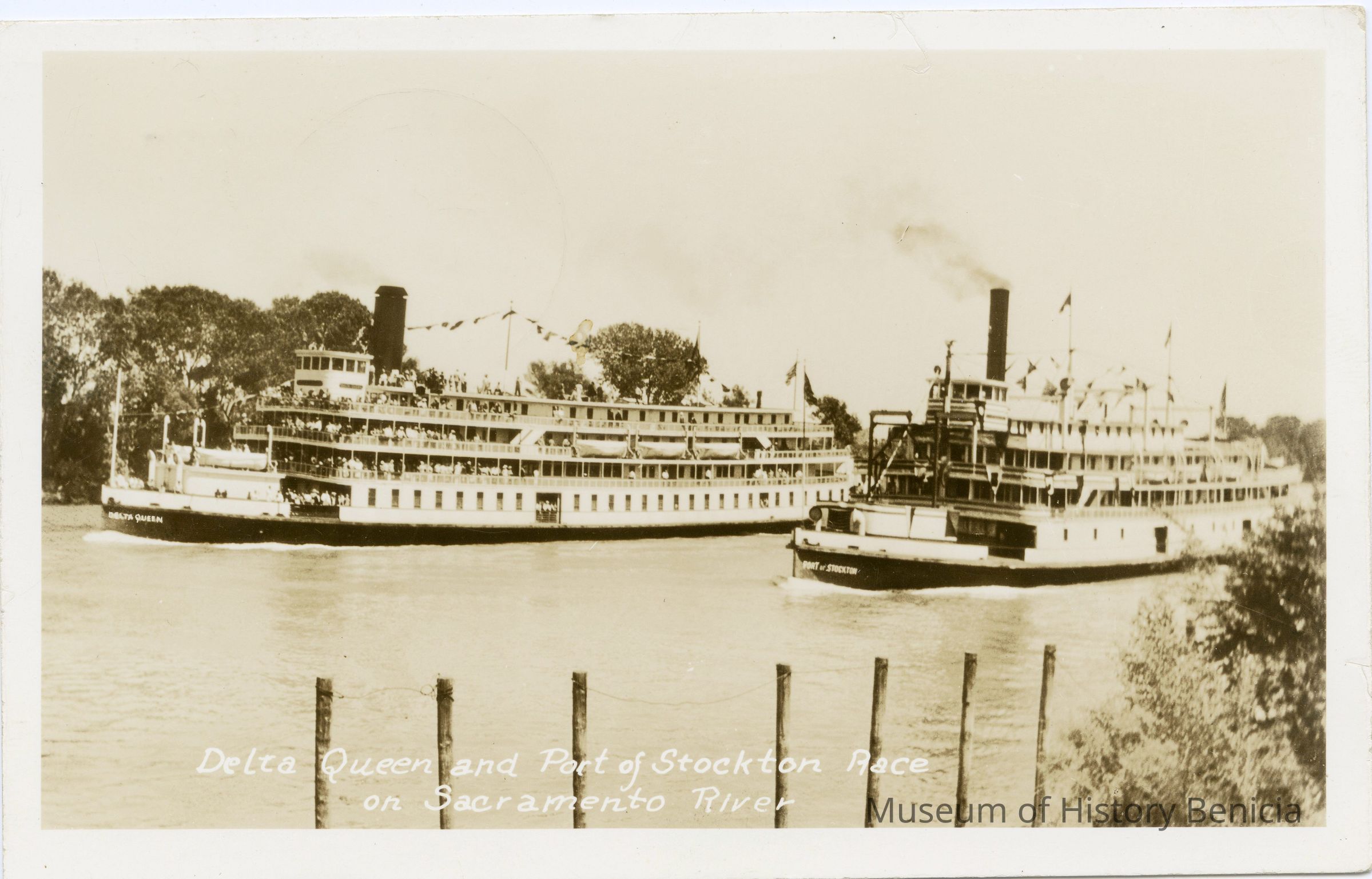 This is a divided back postcard. The photo is of two ships, Delta Queen and the Port of Stockton. The caption says it is a race on the Sacramento River. The card was not published by Frank J. Stumm of Benicia, CA. This is a real photo postcard. The back is addressed to Ray Costa of Vallejo, CA. The message is just confirming when the sender will visit.Collection