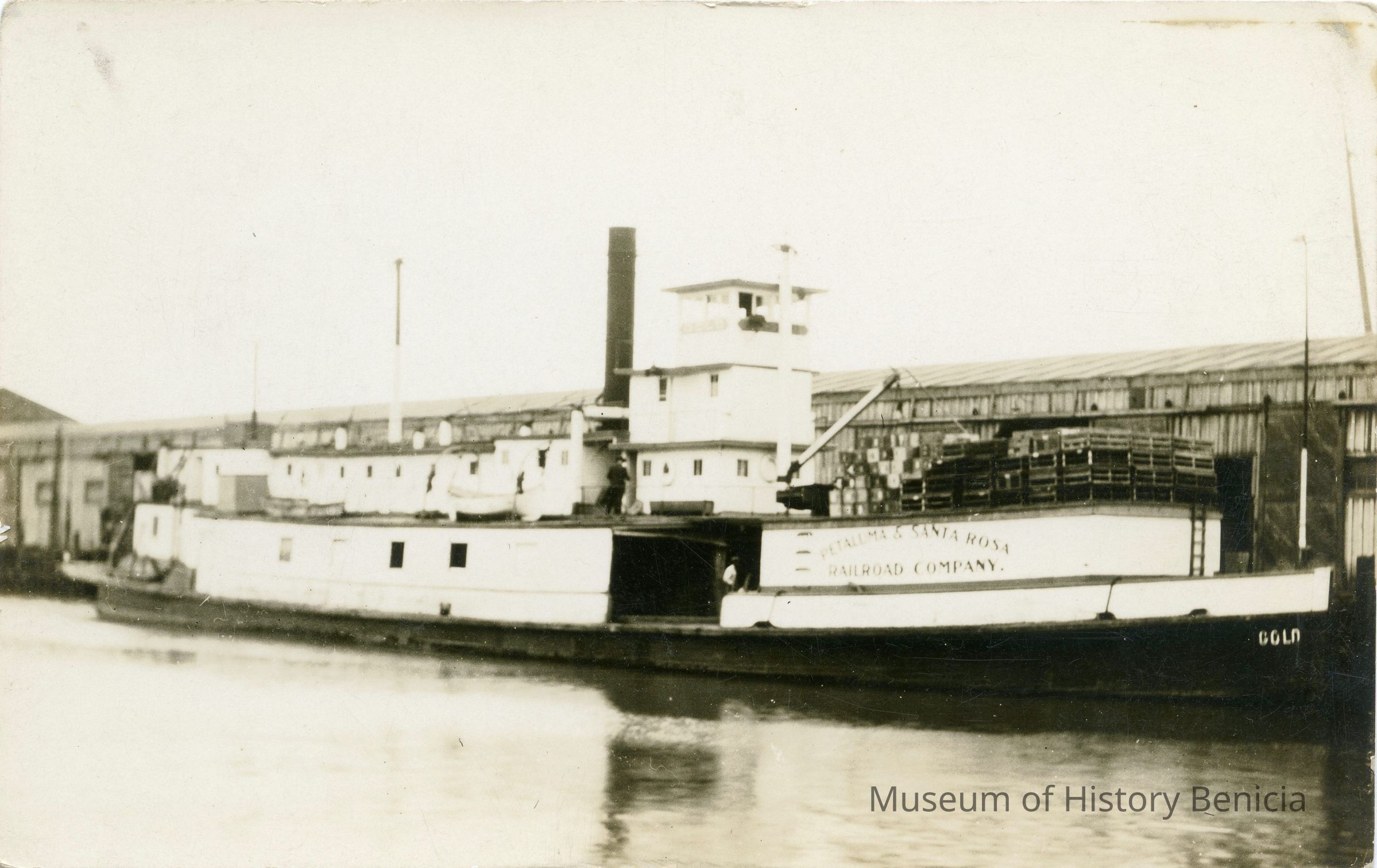 This is a divided back postcard. The photo is of a ship called the "Gold" and belonging to a company identified as "Petaluma and Santa Rosa Railroad Company". The card was not published by Frank J. Stumm of Benicia, CA. This is a real photo postcard. The back is blank.