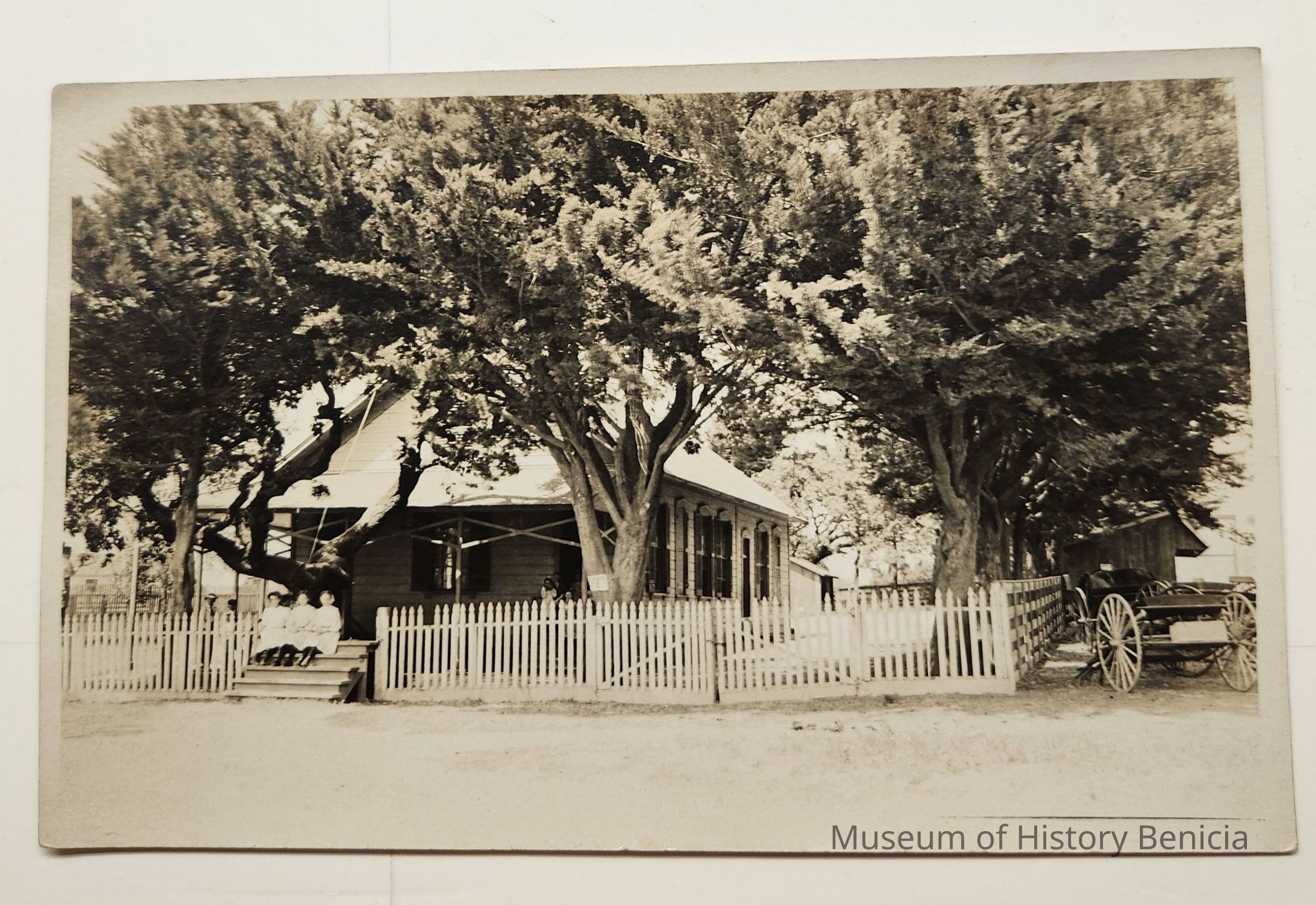 Unused B/W postcard depicting a house surrounded by a picket fence. Three young ladies are sitting on a set of stairs where a gate would be. The house and its location are unidentified.