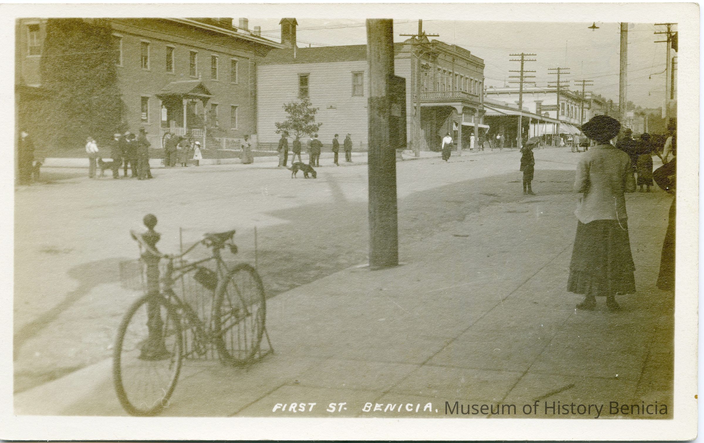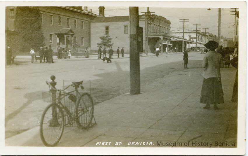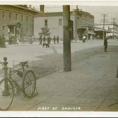 This is a divided back postcard. The photo is of First Street in Benicia looking North. The card was not published by Frank J. Stumm of Benicia, CA. The back is blank.Collection