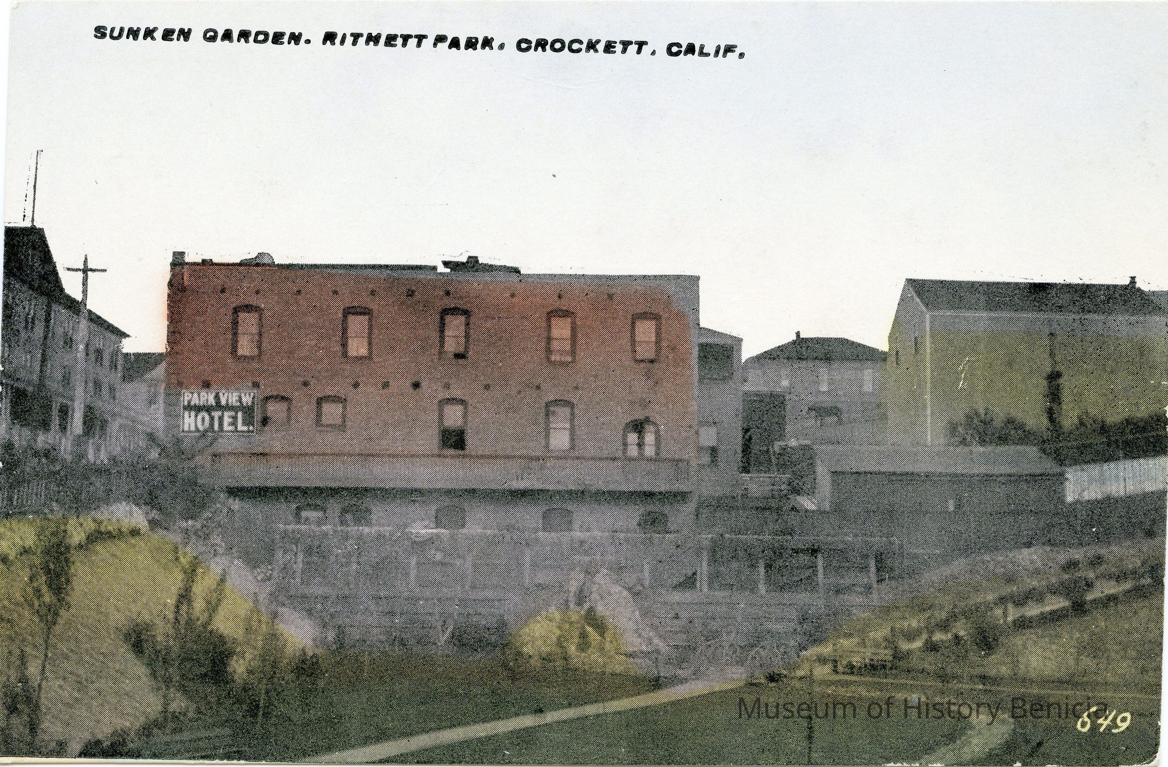 This is a divided back postcard. The photo is of the Sunken Garden - Rithett Park in Crockett, , CA . The card was not published by Frank J. Stumm of Benicia, CA. The back is blank.