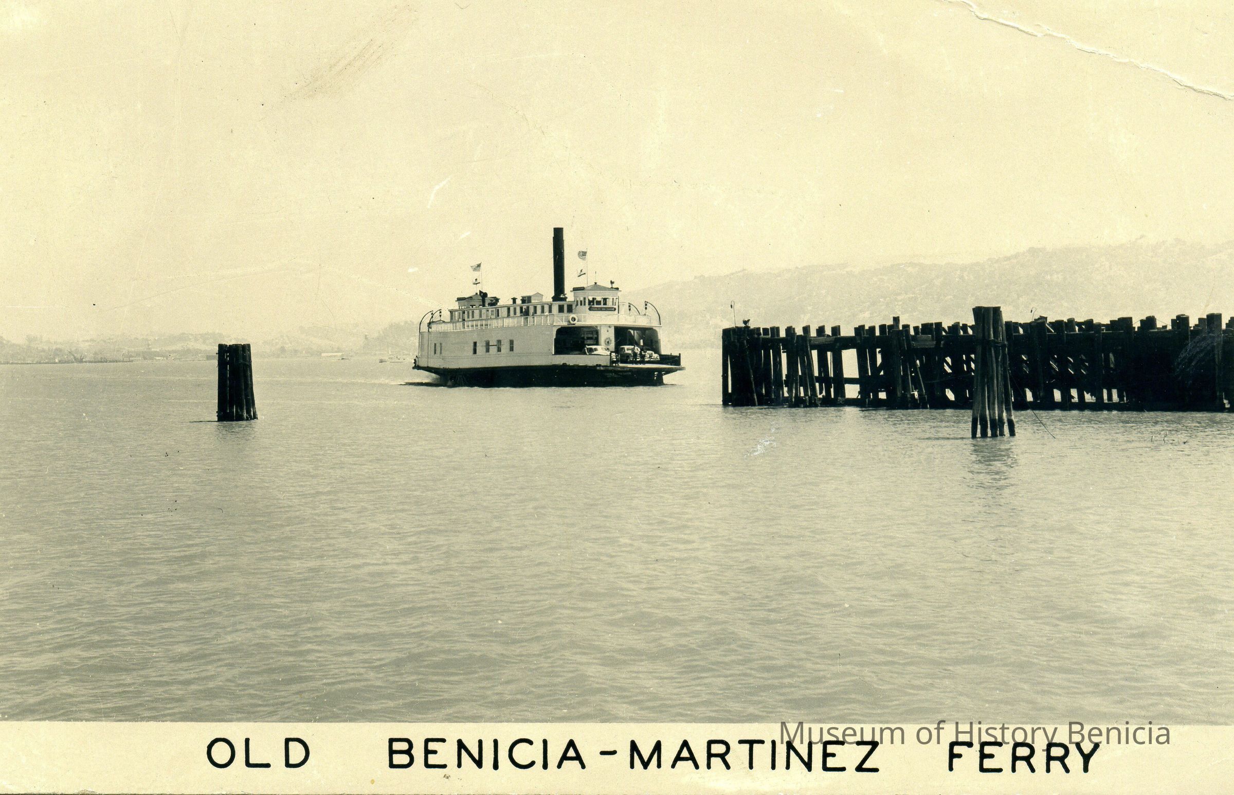 This is a divided back postcard. The photo is of a auto ferry, the Charles Van Damme, coming into Benicia. The back is blank.