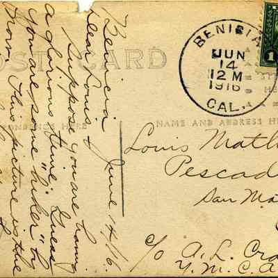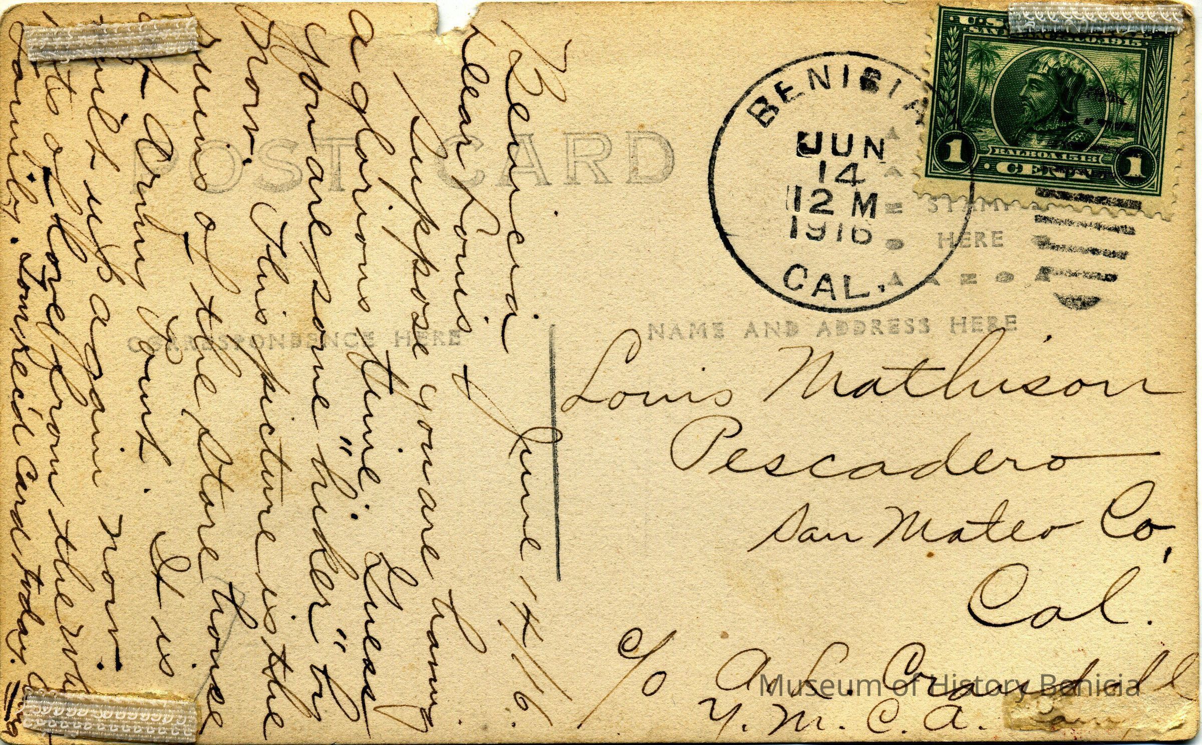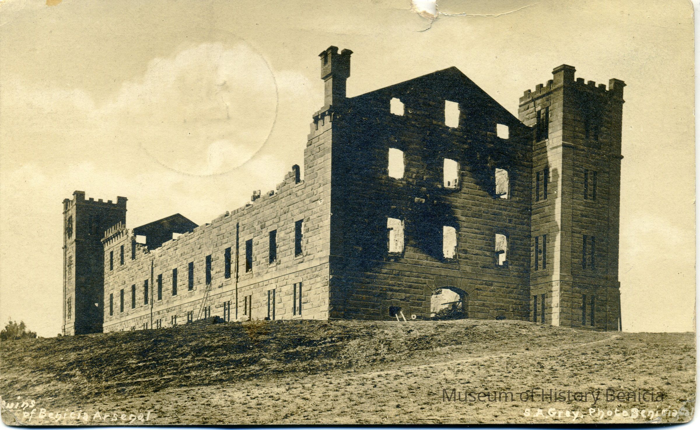 This is a divided back real photo postcard of the ruins of the Clock Tower in Benicia after the fire. The title is ruins of Benicia Arsenal. The back is addressed to Louis Mathison of San Mateo, CA. The message mentions that the photo is of the ruins of the store house at Army Point and is now "built up". This means that it is a two story building rather than three.Collection