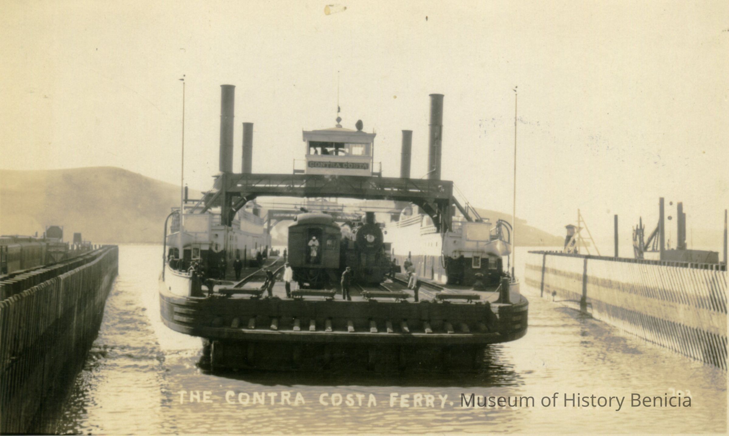 This is a divided back real-photo postcard of the ferry boat Contra Costa in port in Benicia. The back is blank.