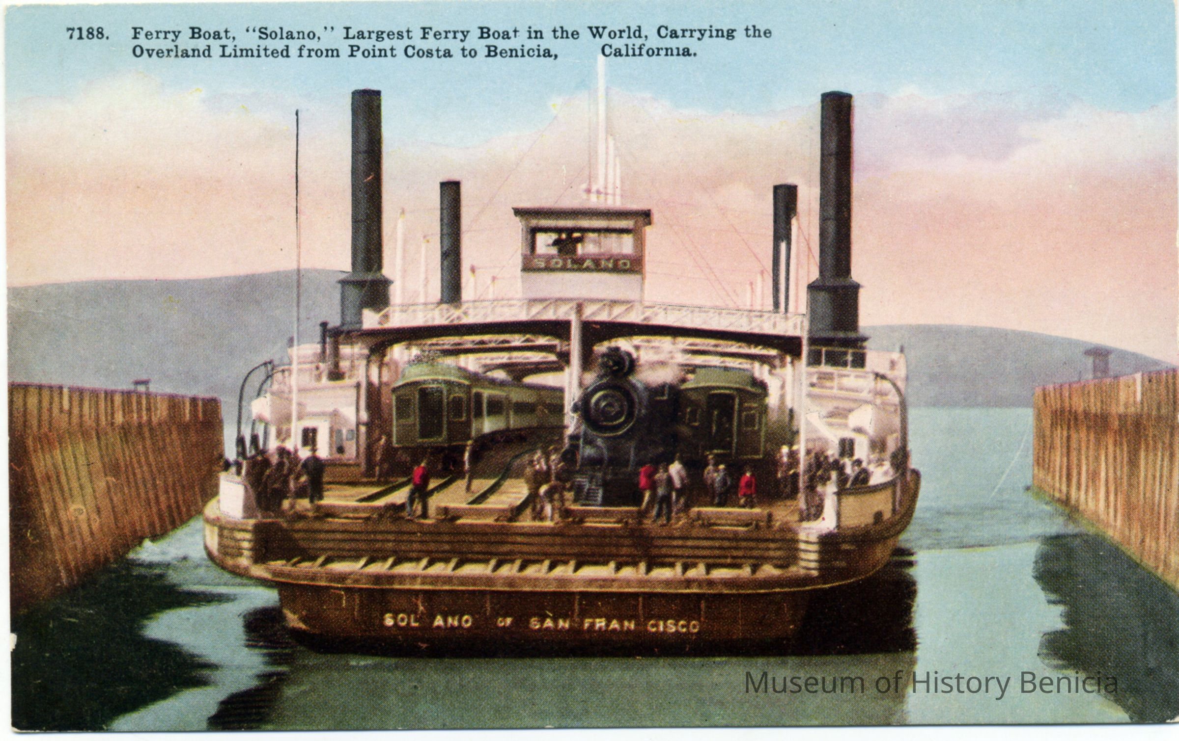 This is a divided back real-photo postcard of the ferry boat Solano in port in Benicia. The caption on the front says "Ferry Boat "Solano" Largest Ferry Boat in the World, Carrying the Overland Limited from Port Costa to Benicia, California." The back is blank.Collection