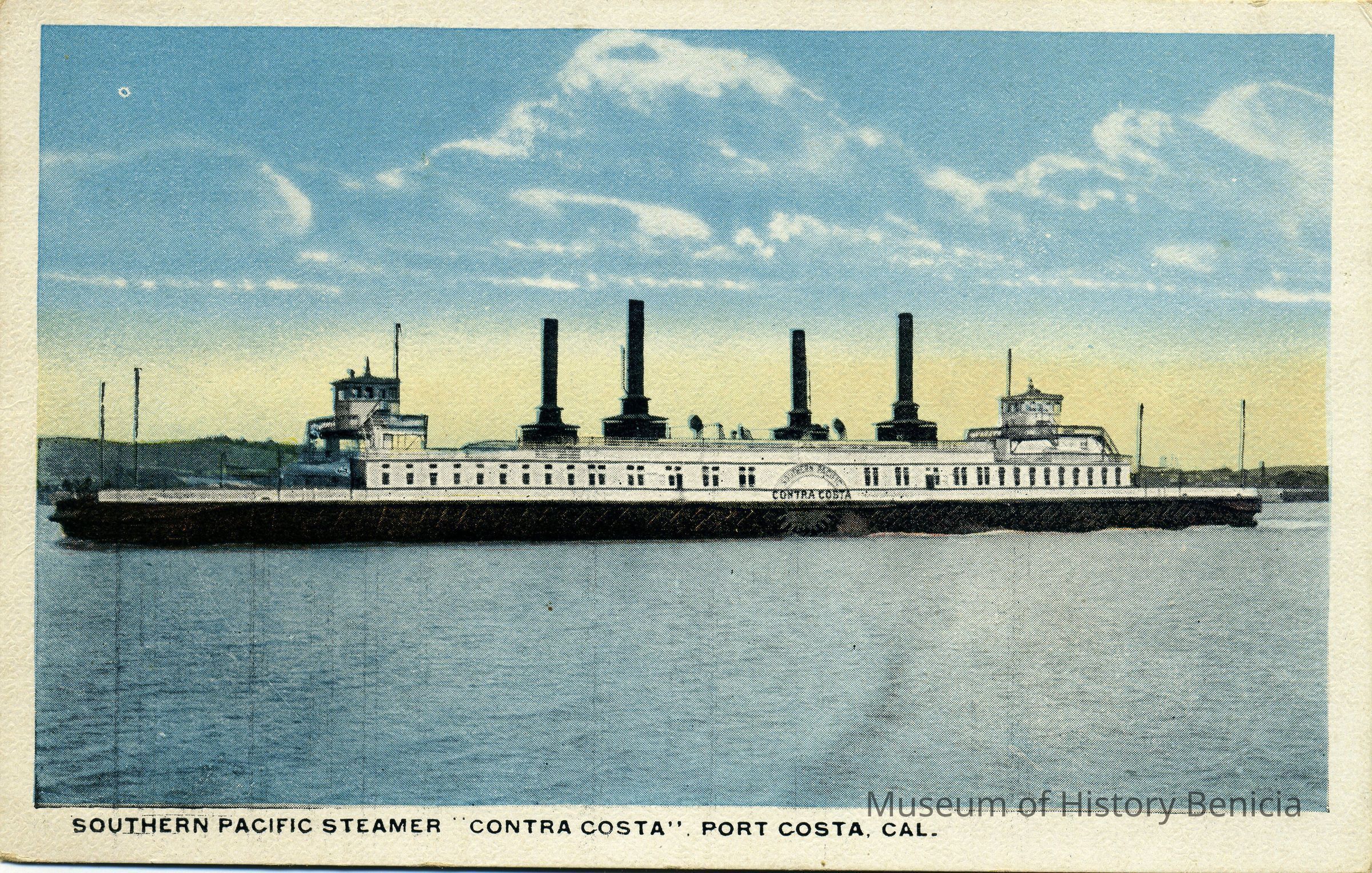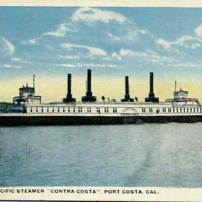 This is a divided back colorized postcard of the ferry boat Contra Costa near Port Costa.