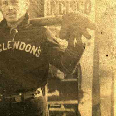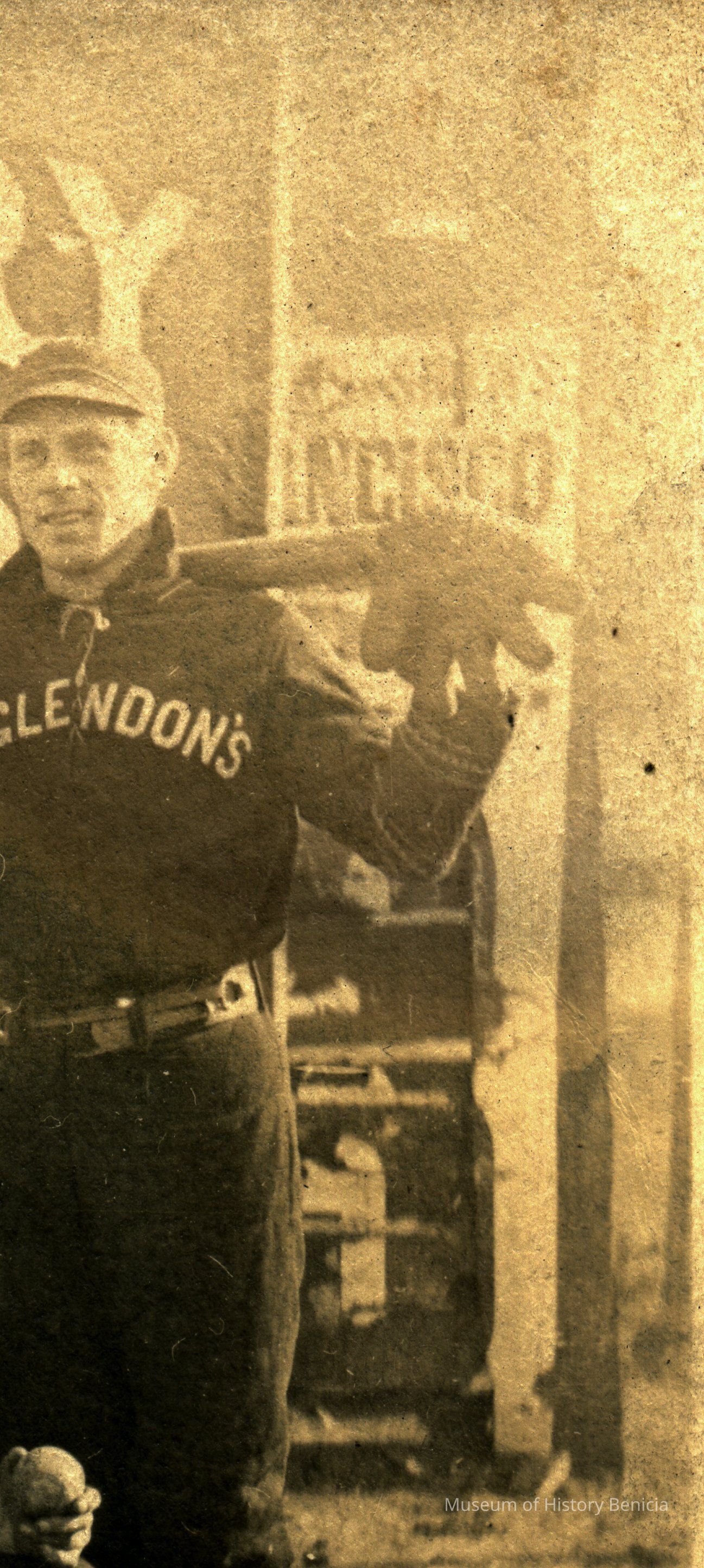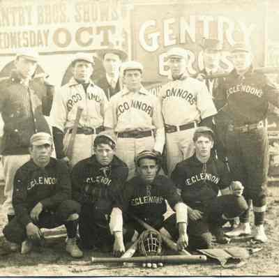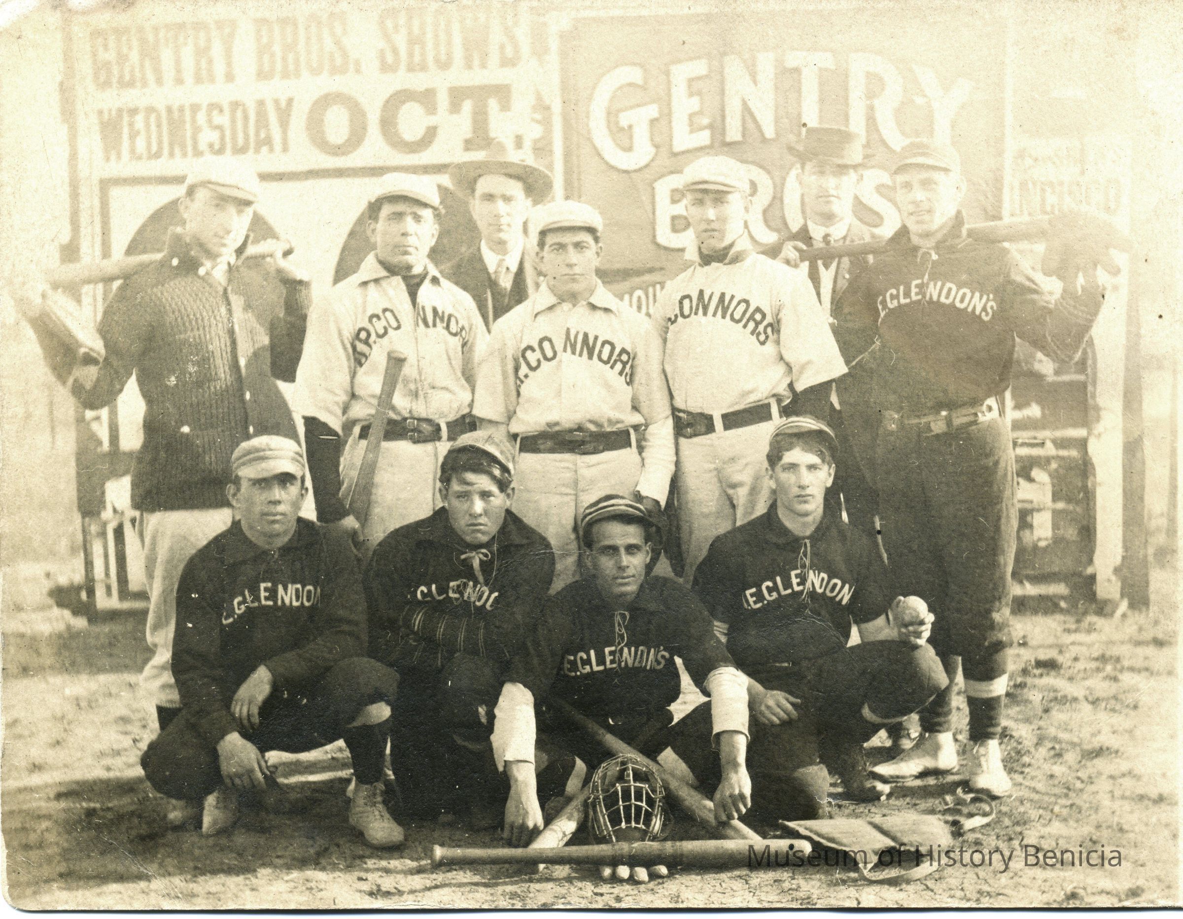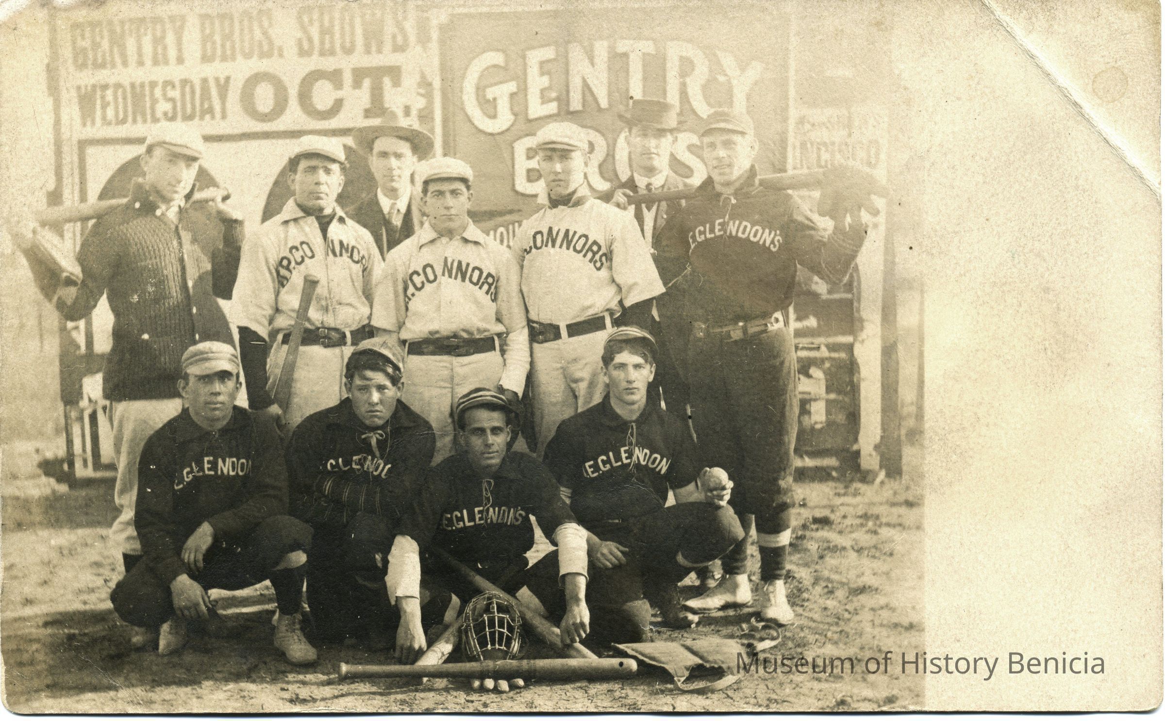 This is a real photo postcard. The back is blank except for a sticker listing the names of the baseball players. It shows members of two teams; the E. Glendon's and the A.P. Connors. The Glendon's are a Benicia team. I'm not sure about the other players. There are signs in the background for the Gentry Brother's Show. They may getting ready nto play an exhibition match.