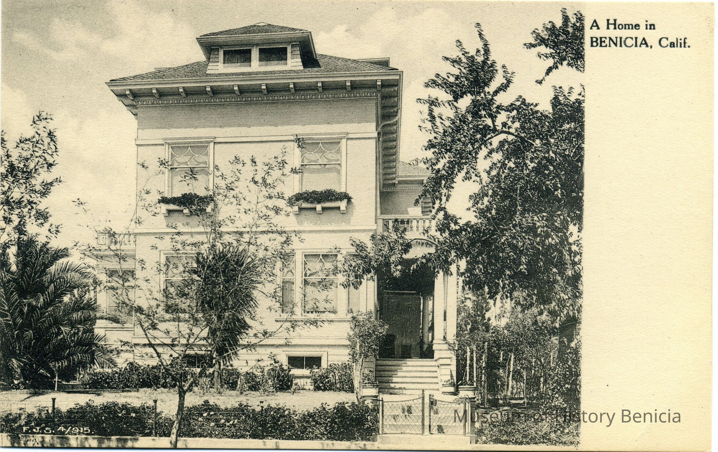This is a real photo divided back postcard of a house in Benicia. The card has white space on the front. It was originally published by Frank J. Stumm. The back lists the Albertype Co. of Brooklyn N.Y. as the printer.Collection