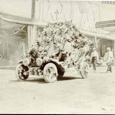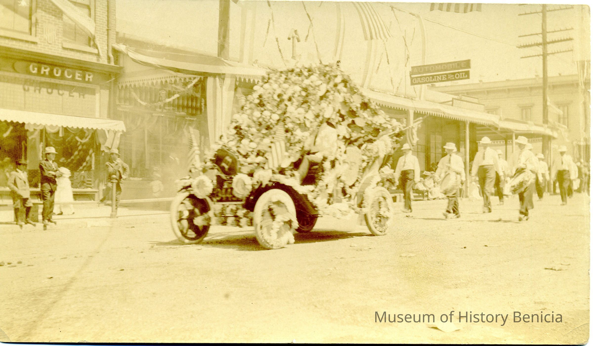 This is a real photo divided back postcard of an old car in a parade in Benicia. There is a band behind the car and the car is decorated with ribbons and banners.Collection