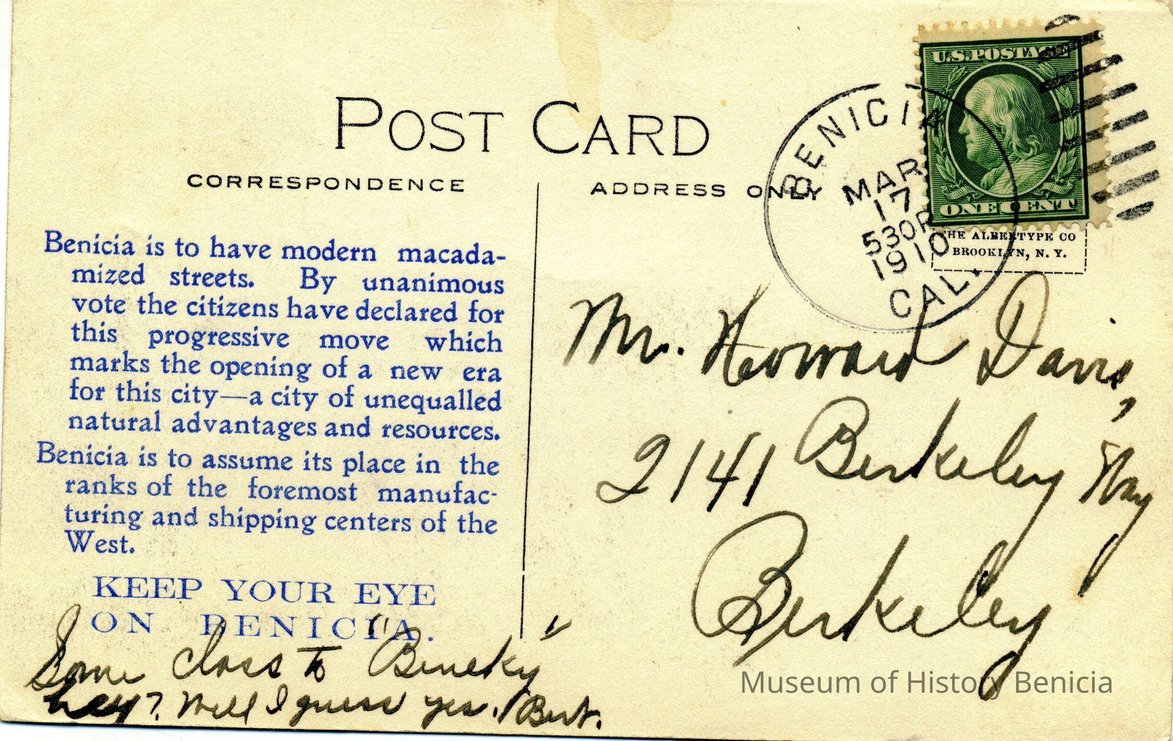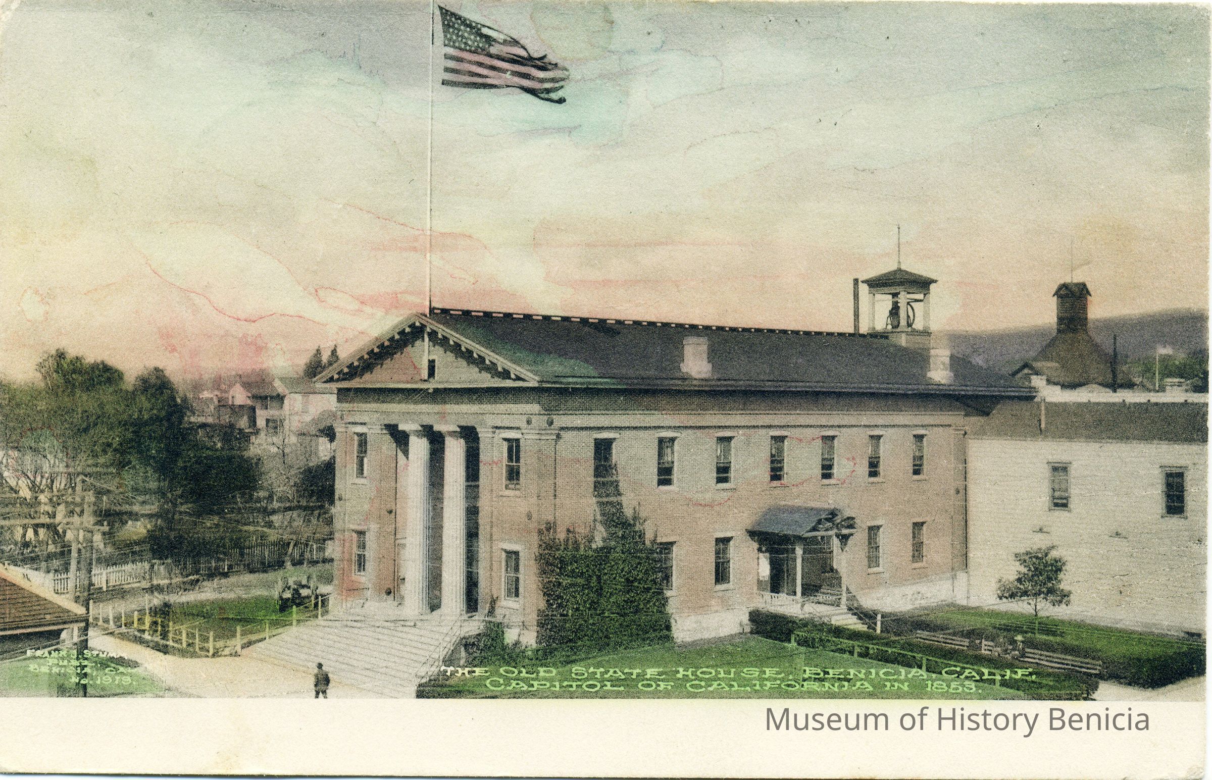 This is a divided back colorized postcard of the old State Capitol. On the back is printed a statement on how modern Benicia has become become we have macadamized roads. The postmark is 03/17/1910 in Benicia. The back is addressed to Mr. Howard W. Davis in Berkeley, CA. The message is "class to Bineky hey? Well I guess yes. Bert. A postit on the card says this was, "from Doc White to my father". The card is published by Frank Stumm of Benicia.