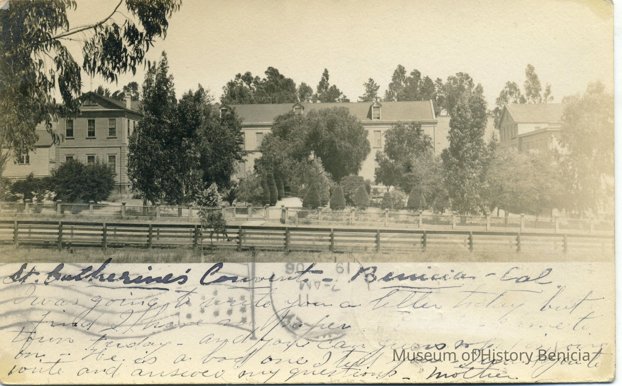 This is an undivided back postcard of St Catherine's Convent in Benicia. The postmark is 09/10/1905 in Benicia. The back is addressed to Mr. Howard W. Davis in Berkeley, CA. The message is from his mother (Daisy). It says she was going to send him a letter but found she has no paper. Most of the message is damaged and not readable. We know the card was originally published by Frank Stumm of Benicia because the image used comes from one of his postcards but has been shrunk to just half the size.