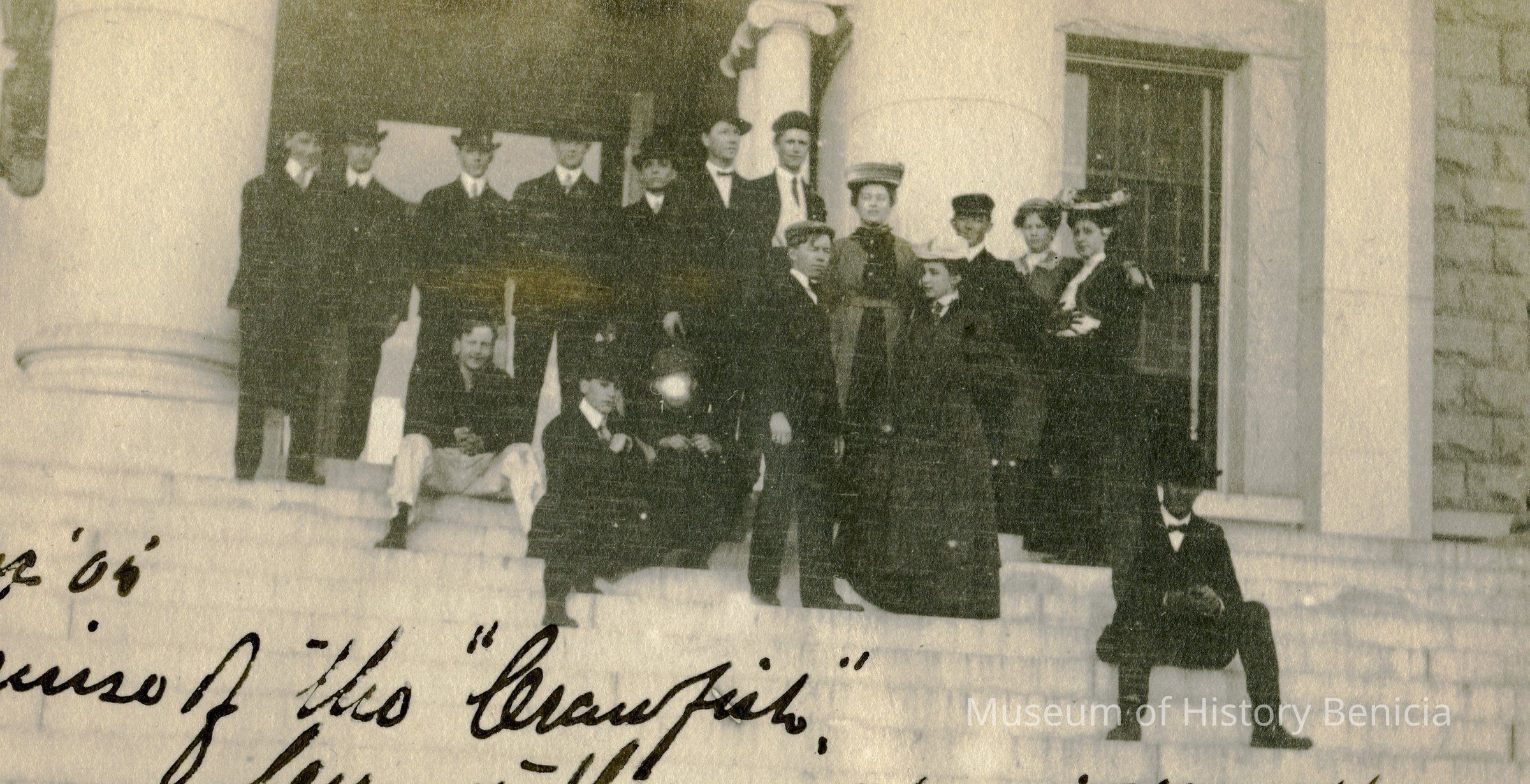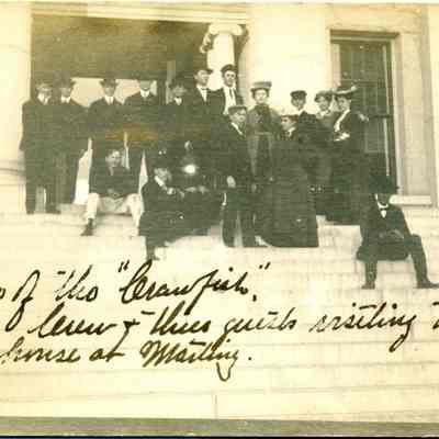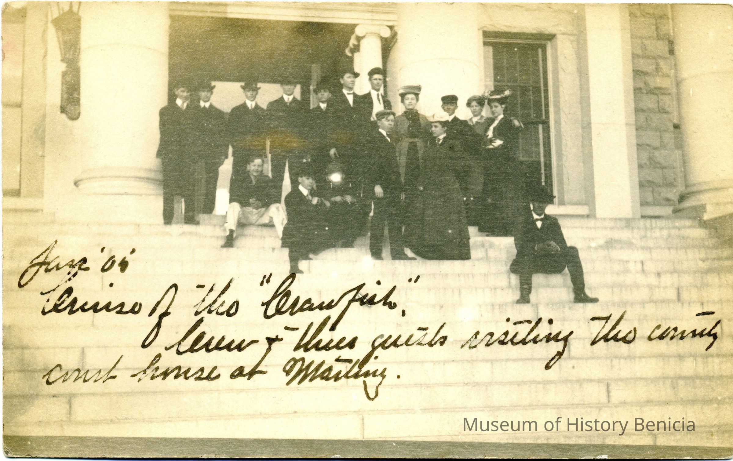 The postcard shows a group of people on the steps of the County Courthouse in Martinez. The inscription says "Cruise of the "Crawfish", crew and these guests visiting the county court house at Martinez." The back is an undivided back and is blank.Collection