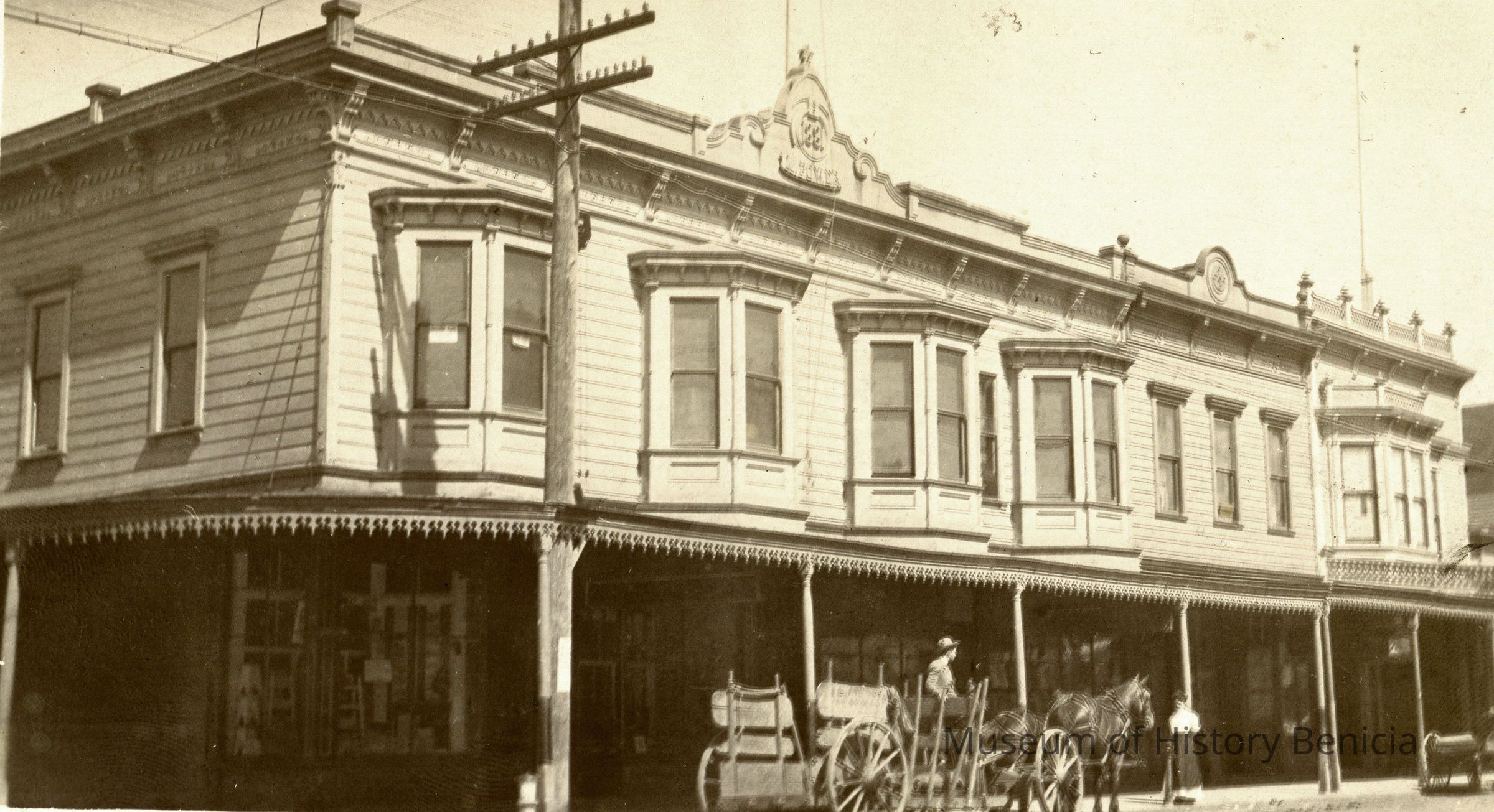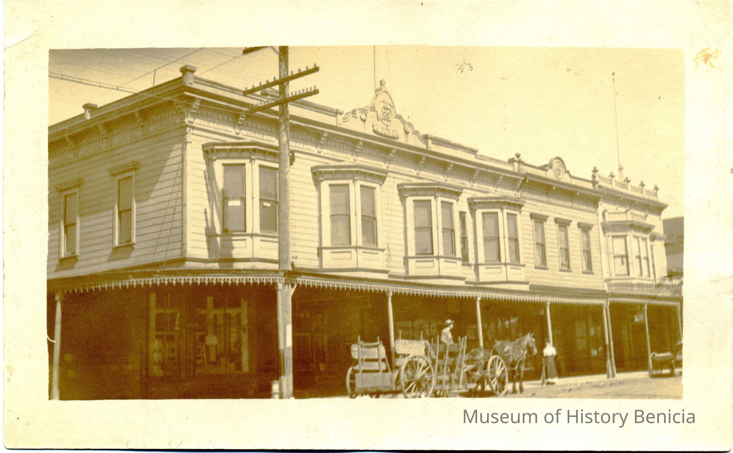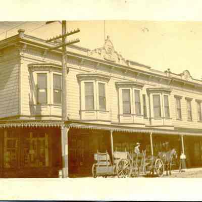 Divided back postcard of First Street with a horse and wagon in front of stores and a man and woman next to the wagon. The postcard is blank. They are in front of the M. Powers building on the NW corner of First and H street. The building was built in 1881.Collection