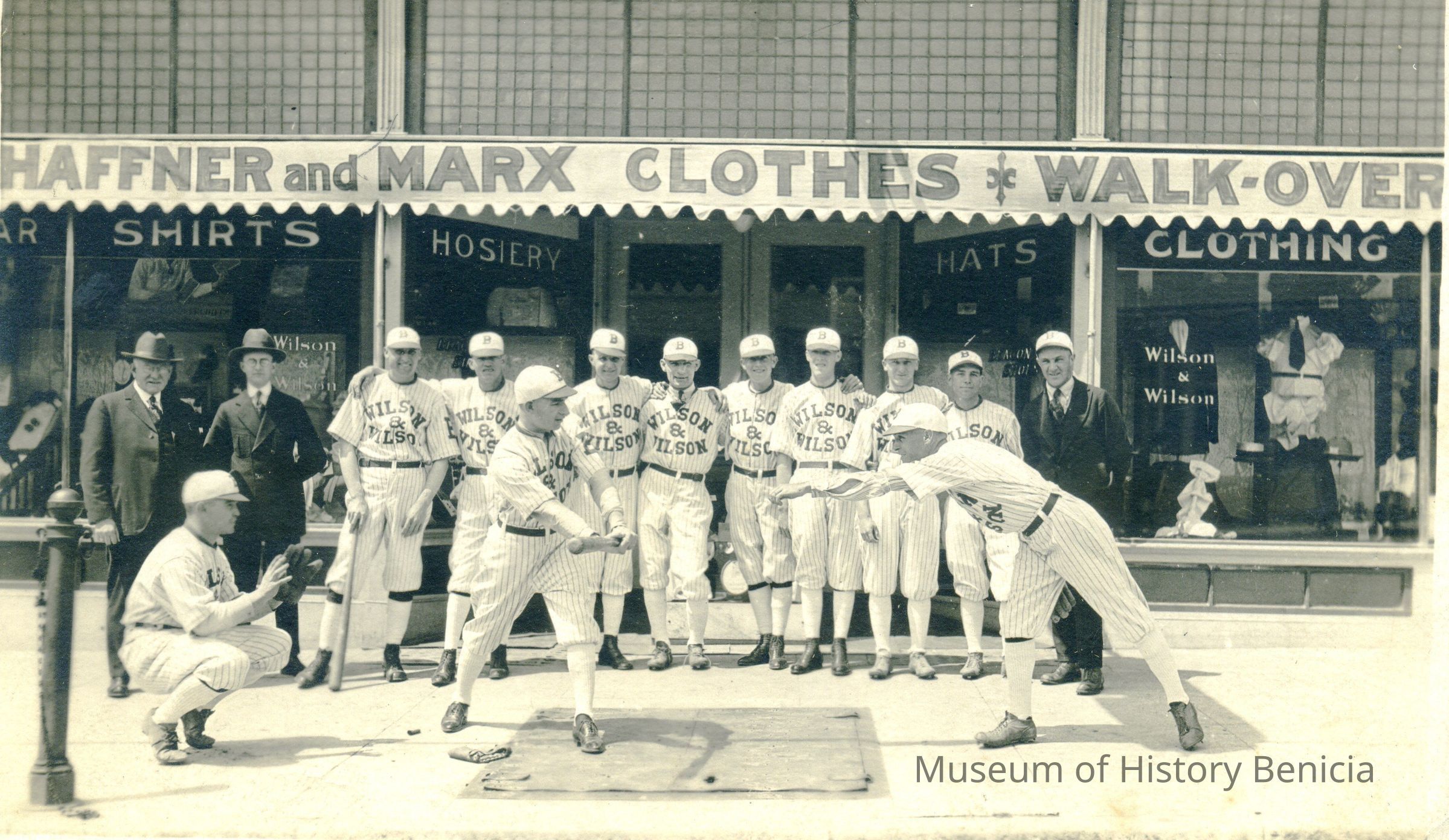 This is a postcard of the baseball team sponsered by Wilson & Wilson clothiers (on First St West side between G and H). The team is lined up in front of the store on First Street. There is a note with the photo that identifies the two men on the left in street clothes as Mr Wilson (father) and his son Roland. They ran the store. The other man in street clothes is the team coach. There is still a hitching post in front of the store and a sidewalk delivery entrance that goes to the basement.Collection