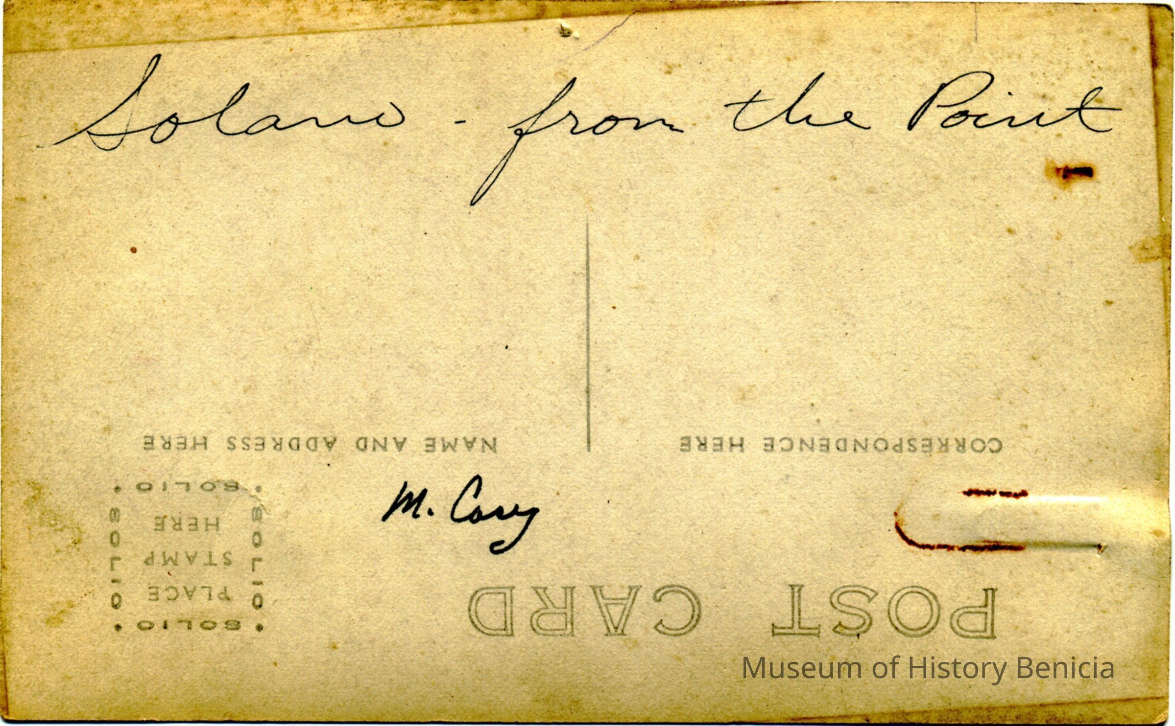 This is a real photo postcard. The back says this is the Solano from the point. It also has the name M Casey on the back. This is probably the name of who owned the photo at one time.