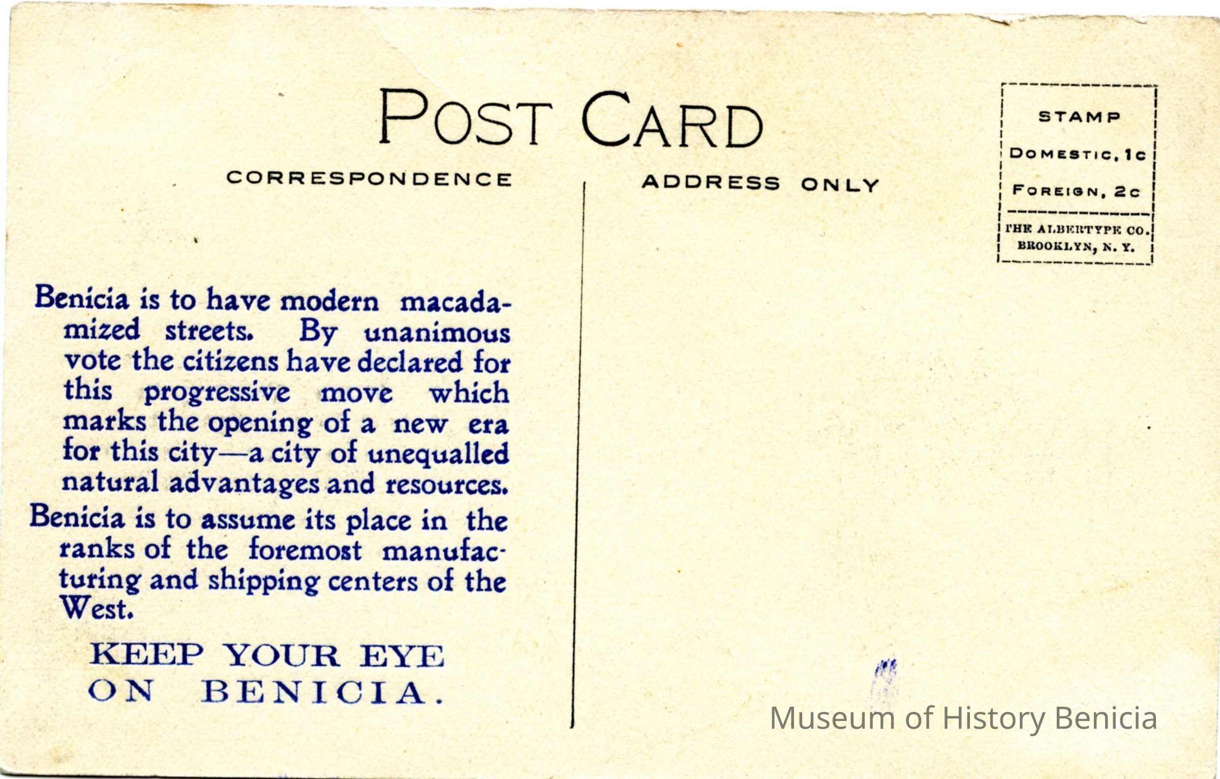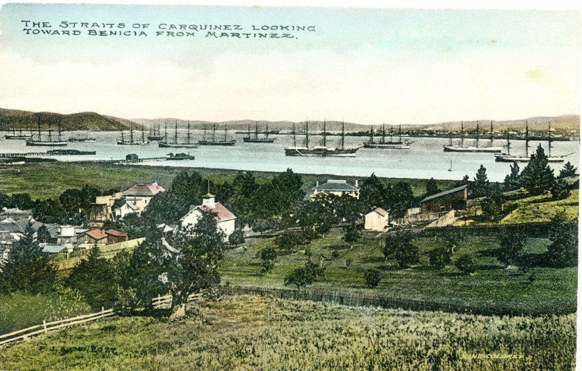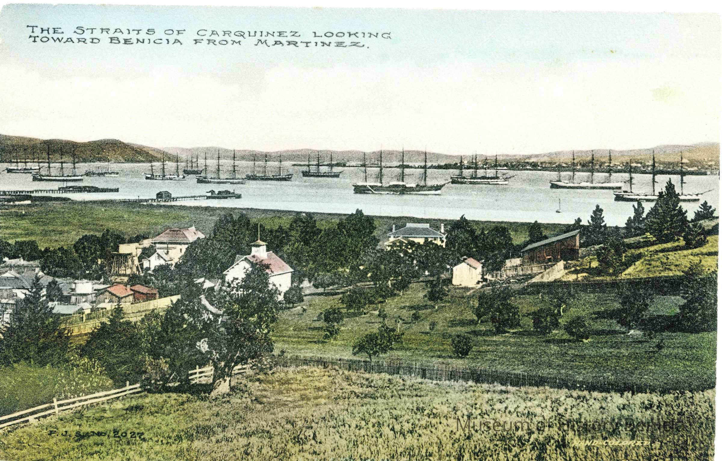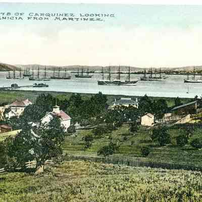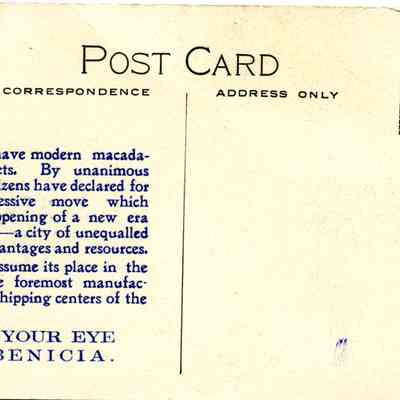 This is a colorized Stumm postcard of the Martinez waterfront. It shows farms in the foreground and sailing ships moored in the Carquinez Straits. The back has a printed statement about Benicia and how it voted to "macadamize" their streets. At the bottom is the message "Keep Your Eye on Benicia".