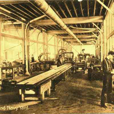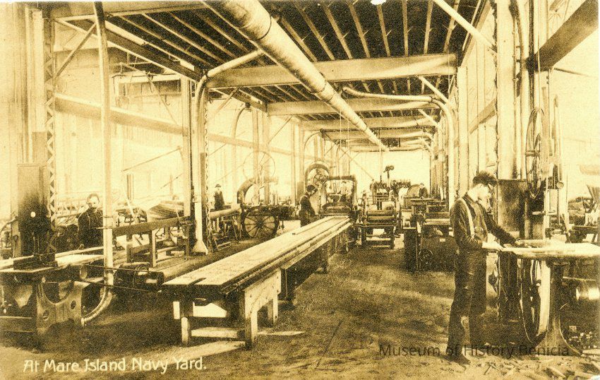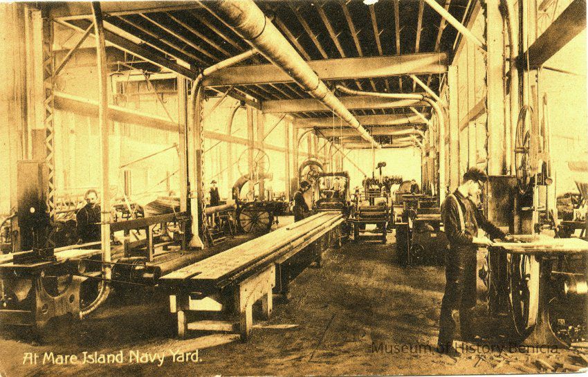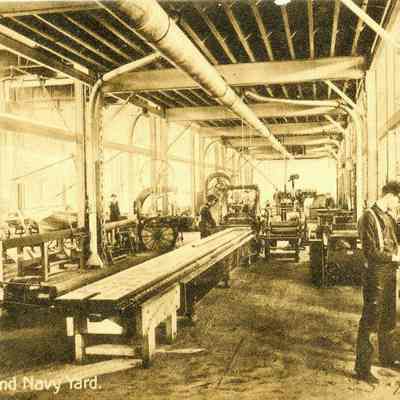 This is an undivided back postcard of the shops on Mare Island, Vallejo, CA. The back is blank.