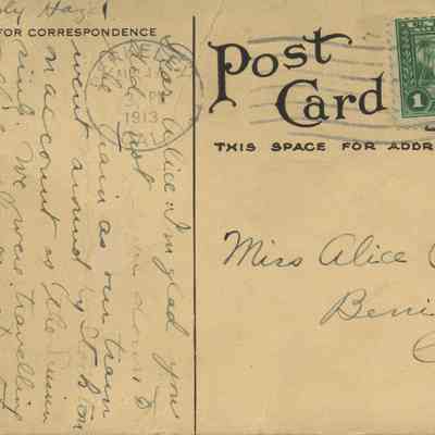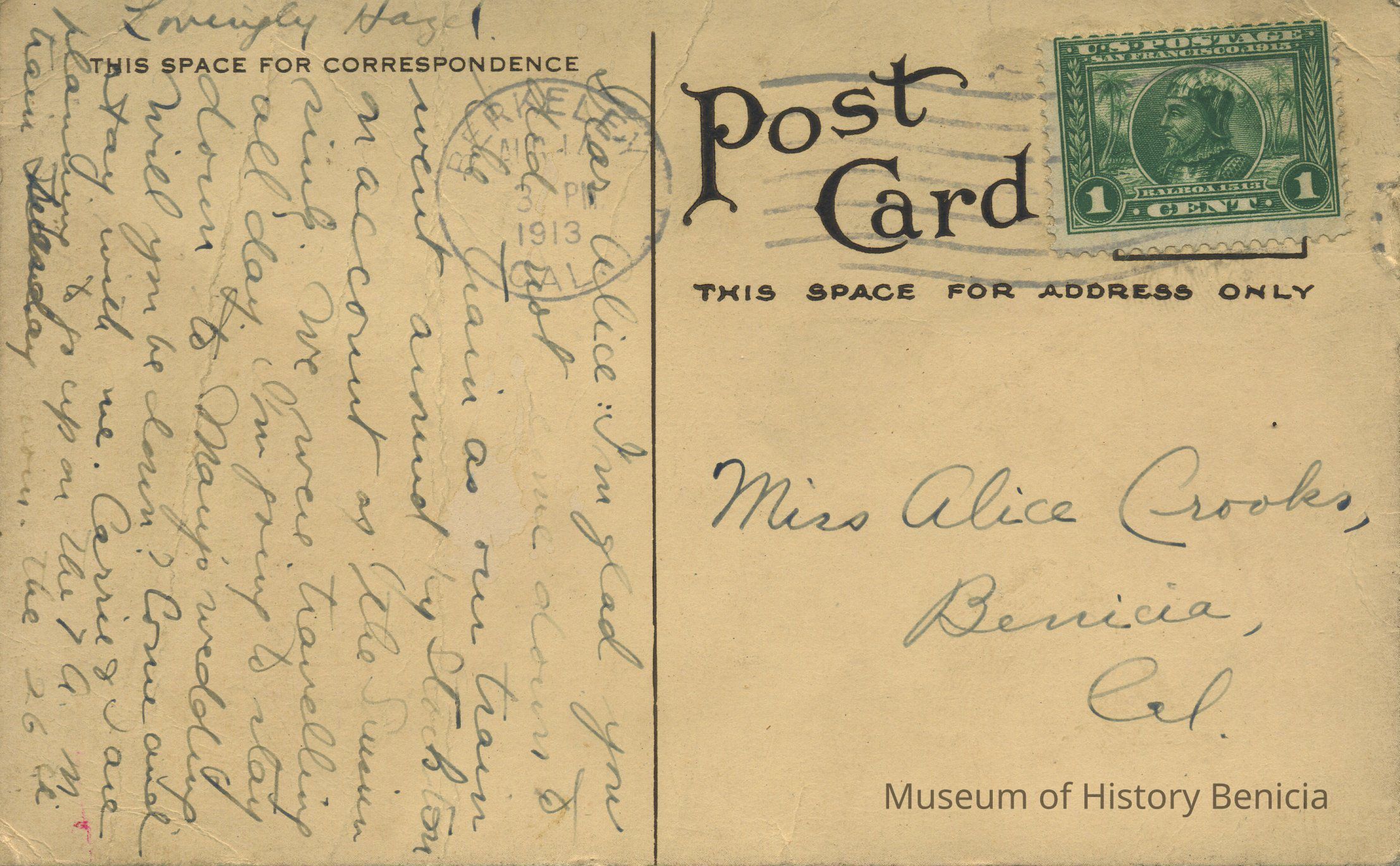 Card was sent to "Miss Alice Crooks, Benicia, Cal." in 1913 from Berkeley, Cal.