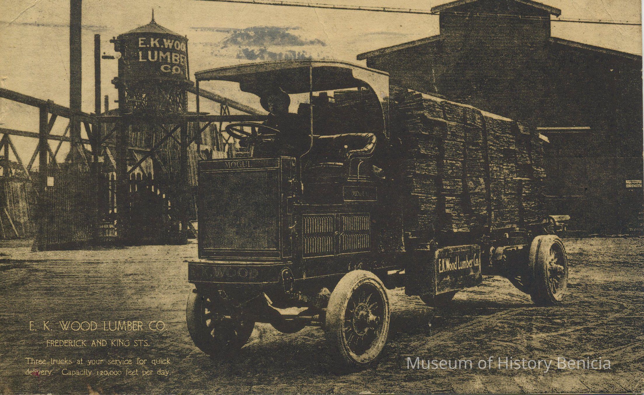 Postcard, B/W picture - "E.K. Wood Lumber Co., Frederick and King Sts. Three trucks at your service for quick delivery, capacity 120,000 feet per day."