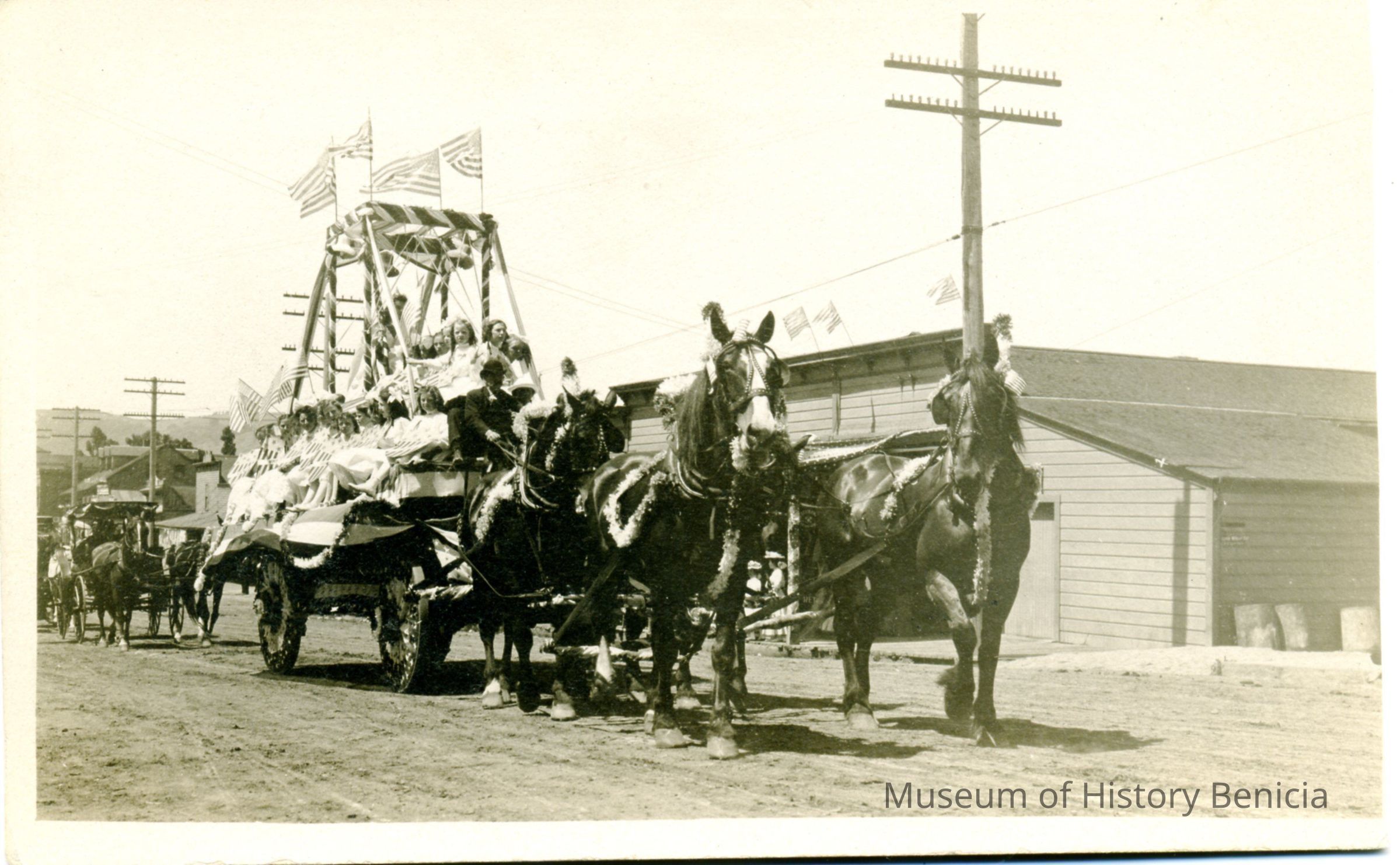 This is an unused postcard of a float in a parade on First St Benicia. It is a horse drawn wagon with the queen and her court riding on top. It is similar to 2008.015.0038 which was attributed to Frank Stumm.