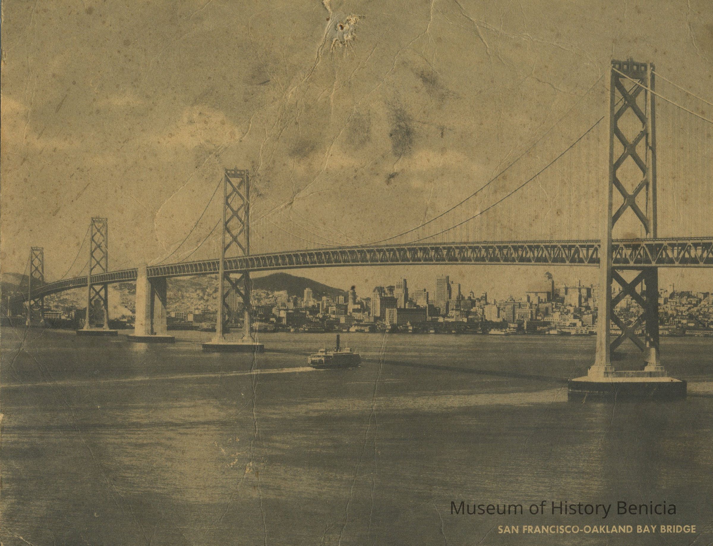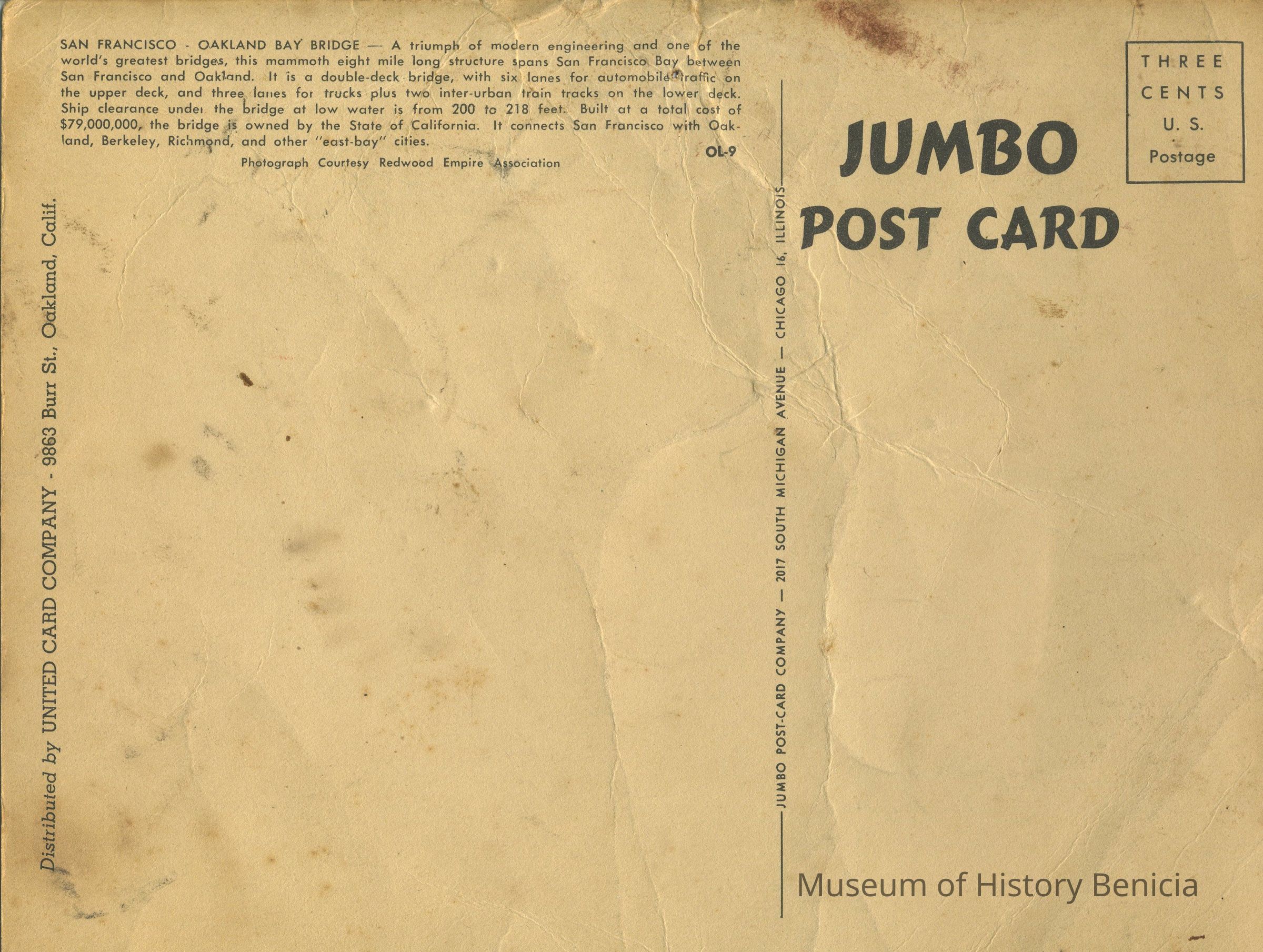 B/W photograph on a postcard. San Francisco-Oakland Bay Bridge, "Jumboe Post Card". Information about the bridge is on the back. Photo courtesy of Redwood Empire Association (# OL-9). Published by Jumbo Post Card Co. , 2017 So. Michigan Ave., Chicago 14, IL. Distributed by United Card Company, 9863 Burr St., Oakland, Calif.