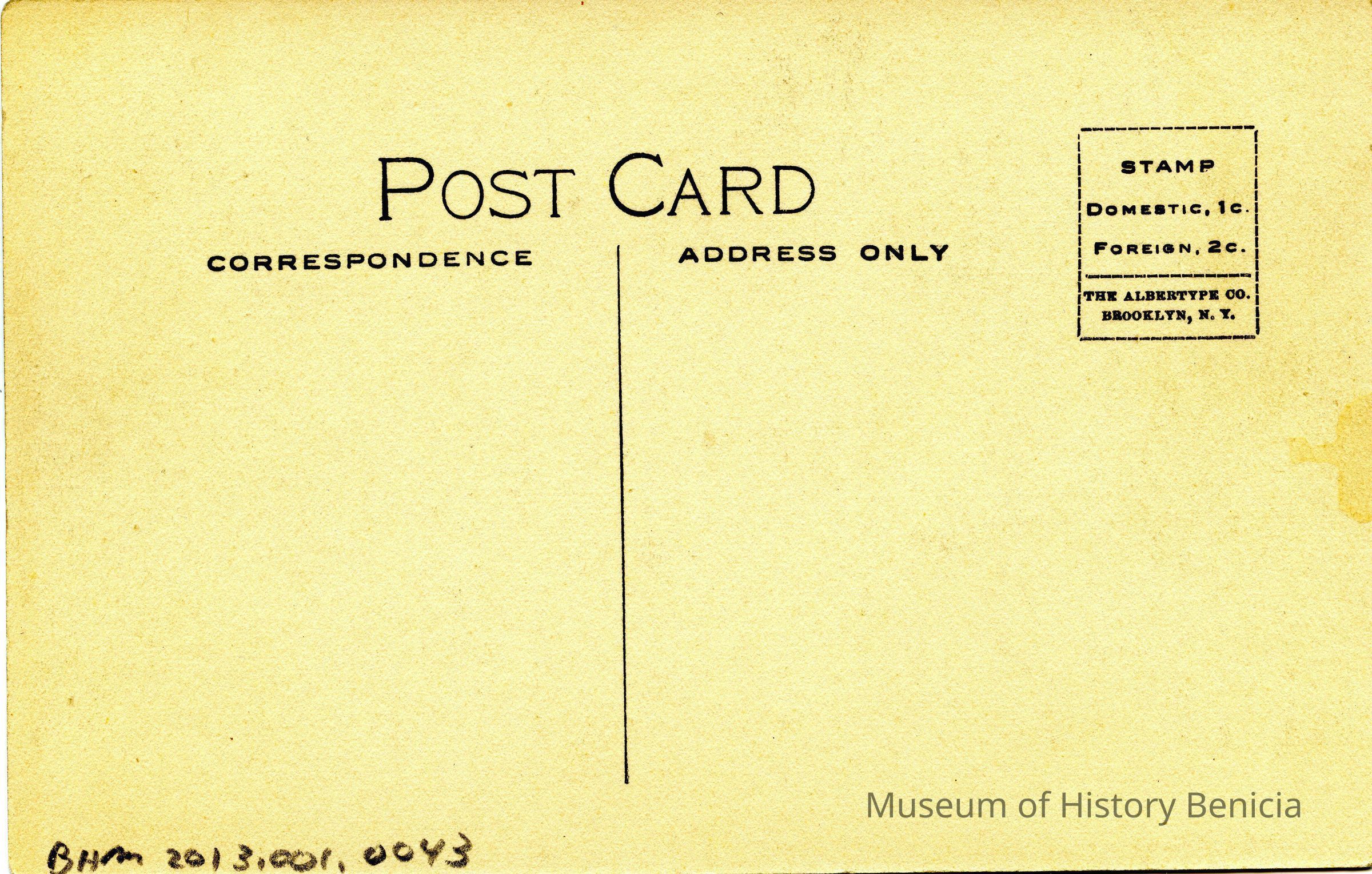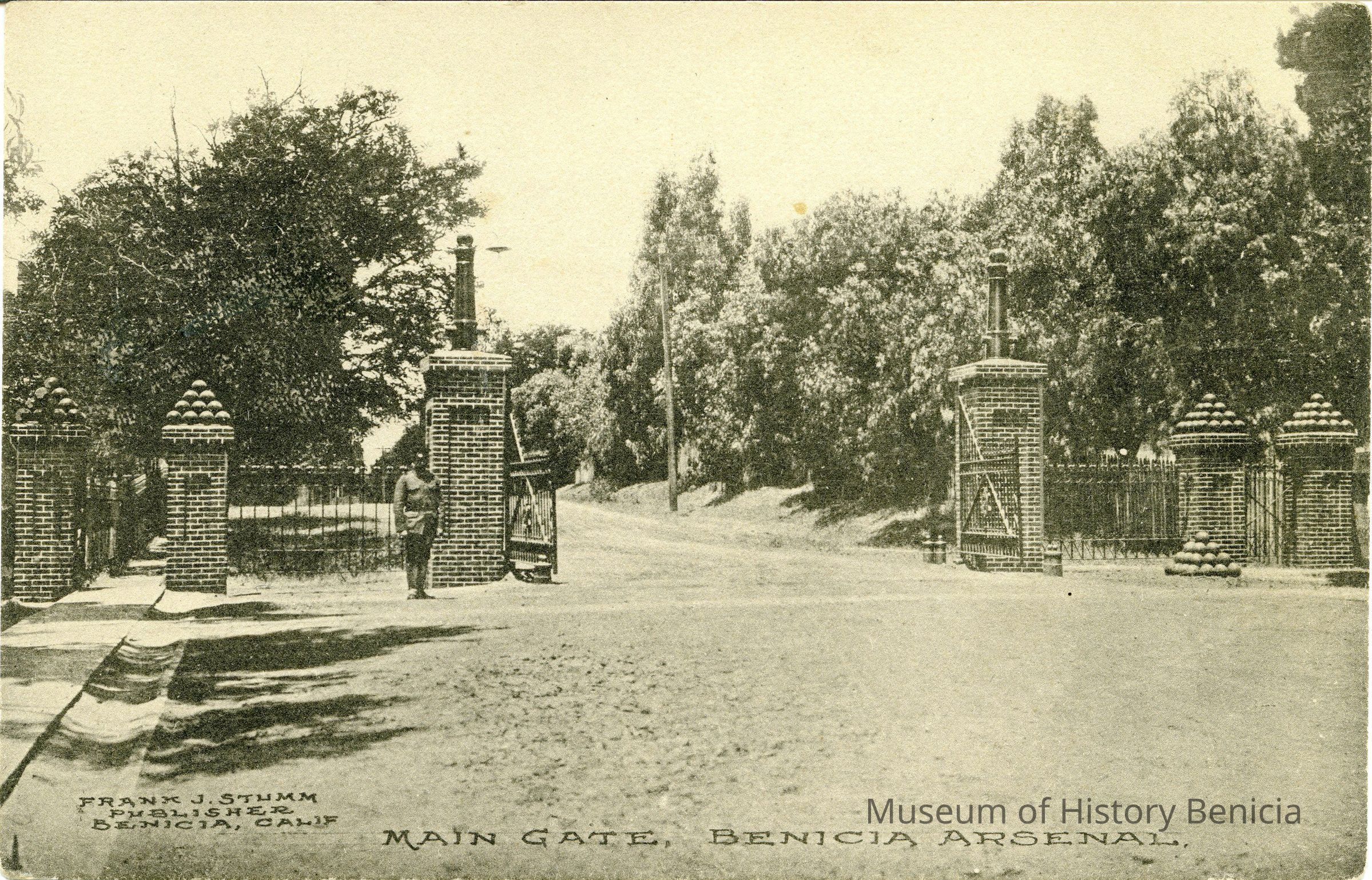 This is a divided back postcard of the Main Gate at the Benicia Arsenal. It is by Frank J. Stumm Publisher Benicia, Cal. The card is black & white and shows a wrought iron gate with brick posts. Some are topped with cannon balls. at the Arsenal.