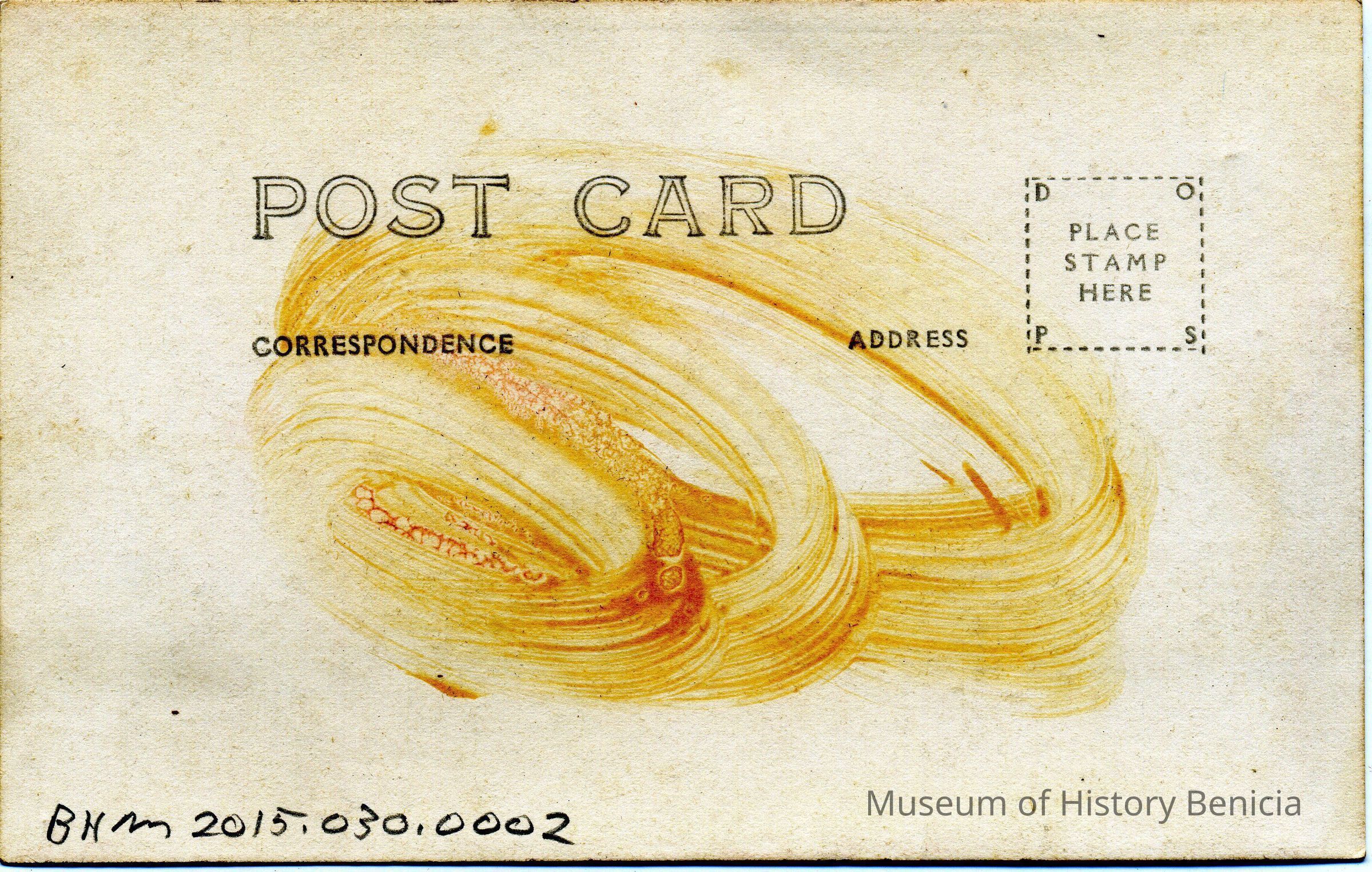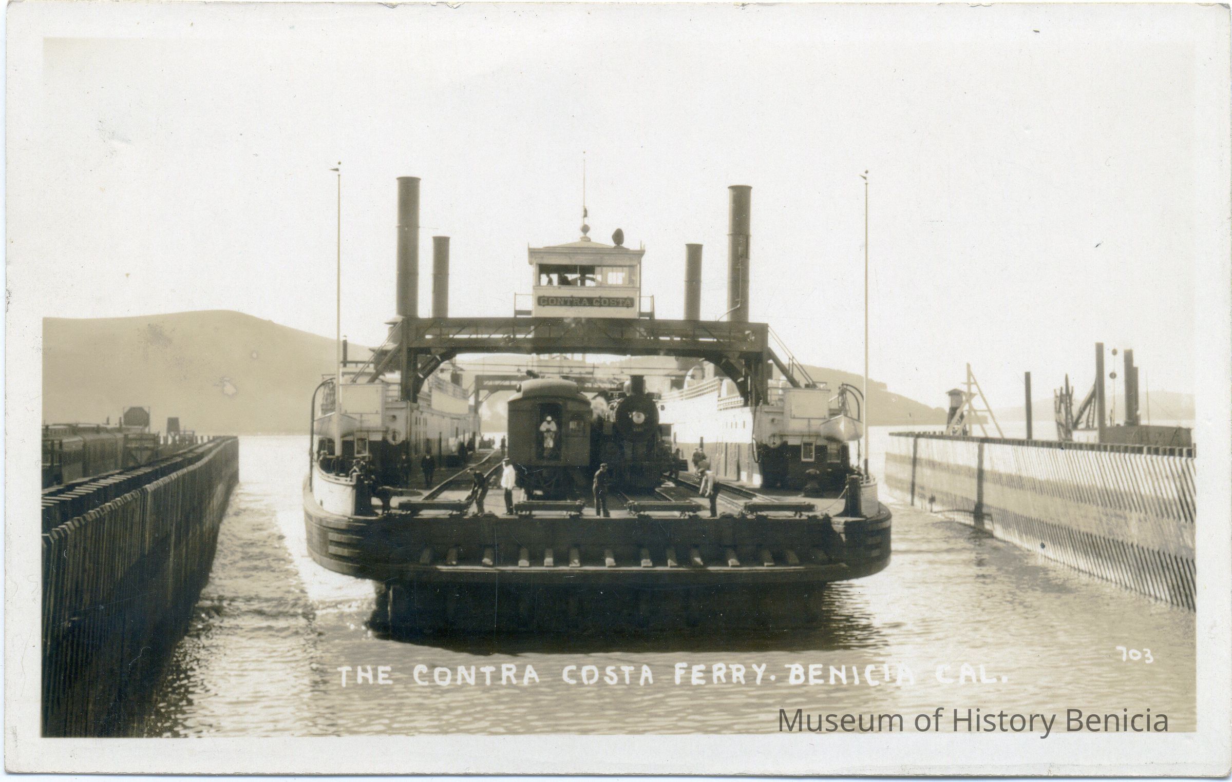 Photo postcard of the ferryboat Contra Costa in dock at Benicia. It shows men working on the back and a train loaded on board. The back is blank.Collection