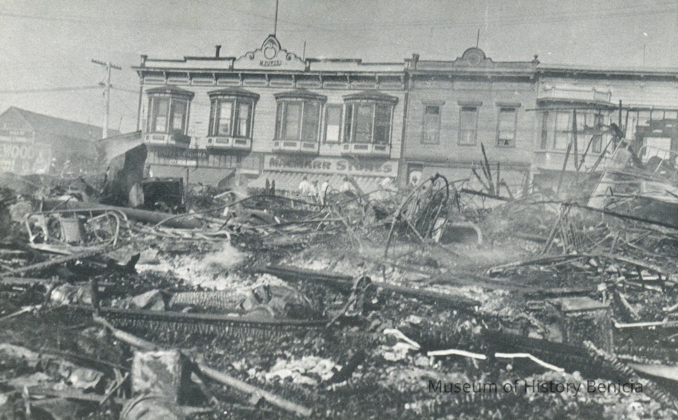 B/W Postcard Photograph - The Palace Hotel Destroyed. Circa 1933 the Palace was destroyed by fire. The Benicia Herald newspaper office, and other businesses, are now located on the First Street site. Note city drug store in background which was destroyed by fire in 1982.