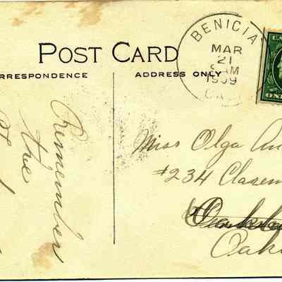 This is a real photo divided back postcard of St. Paul's Church, Guild Hal andRectory in Benicia California. There is writting on the bottom of the face of the card. It says: