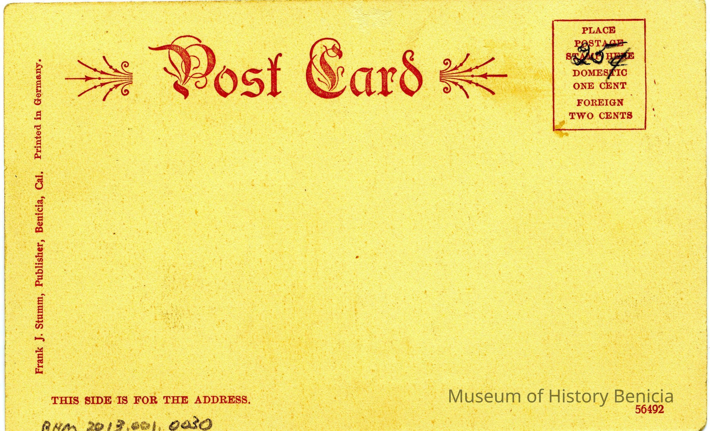 This is an address only back postcard of Capt. Matthew Turner's Shipyard in Benicia Cal. It is sepia colored and was published by Frank J. Stumm Publisher Benicia, Cal and printed in Germany. The caption is "Benicia Capt. Matthew Turner's Shipyard". The back is blank.
