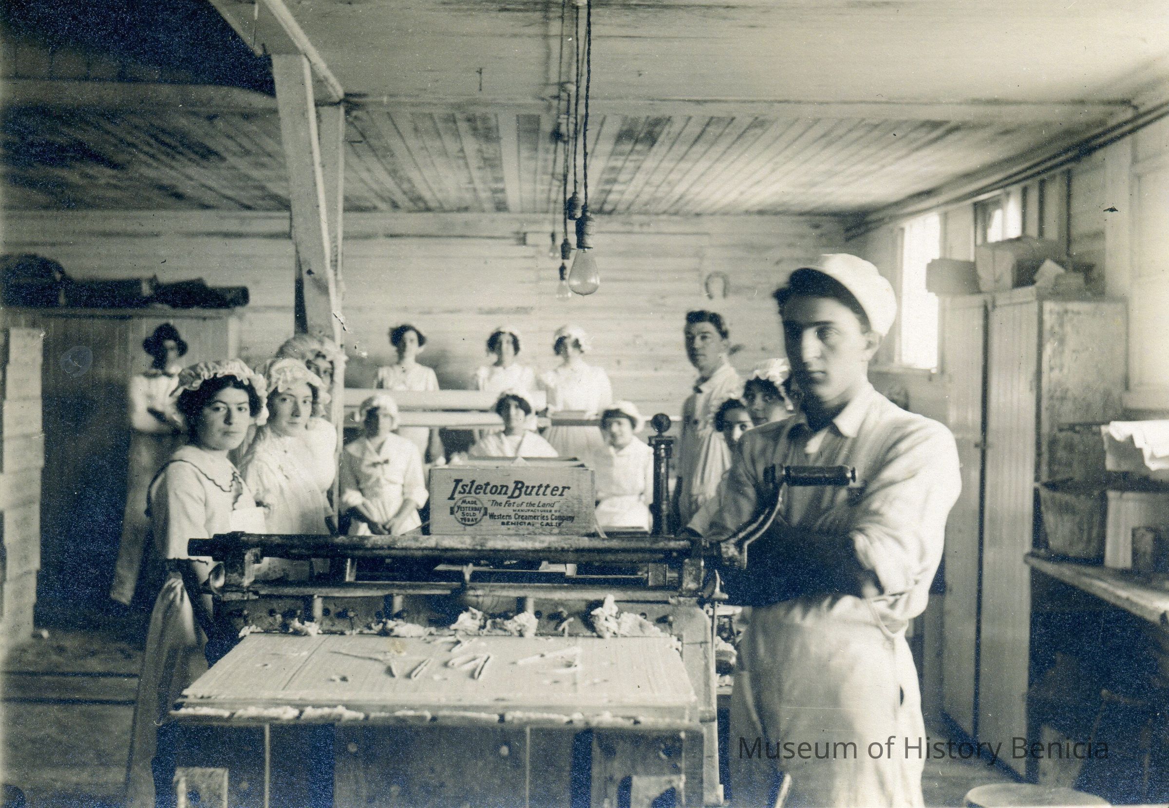 B/W photograph of workers at the Benicia company Western Creamery. Shows several workers.