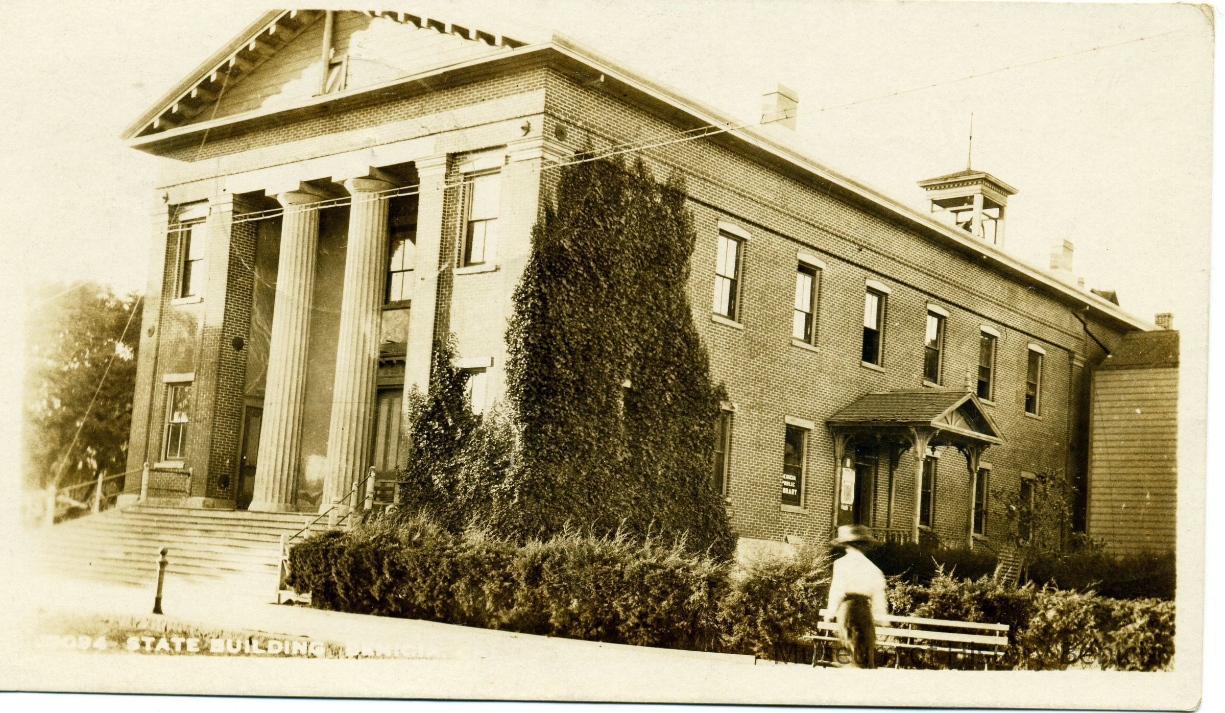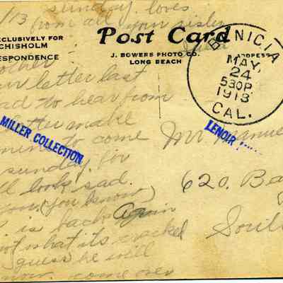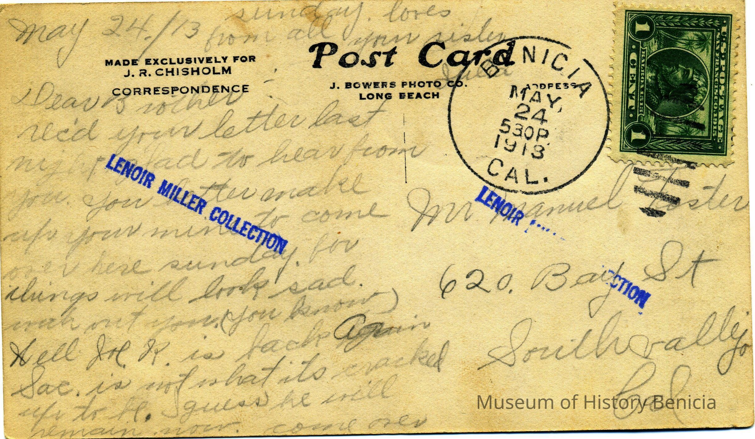 This is a photo postcard of the Old State Capitol in Benicia. It was made as a postcard by J. Bowers Co. in Long Beach, CA for J.R. Chisholm. It is addressed to Mr. Manuel Foster in South Vallejo, CA. The message just talks about family business.Collection