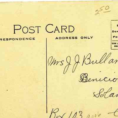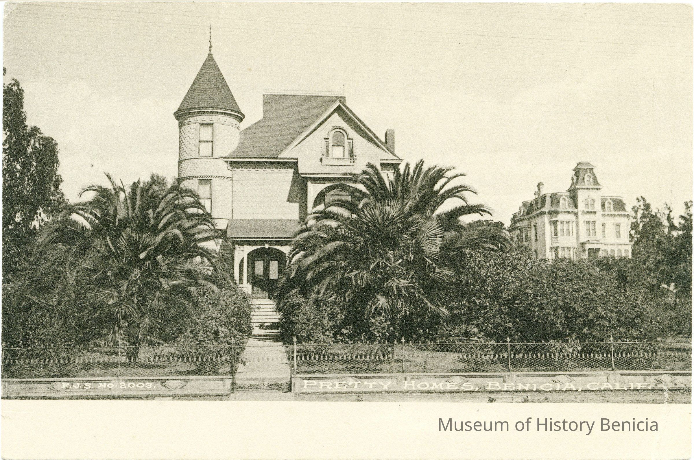 This is a divided back postcard of homes in Benicia It is black & white and was published by F.J.S. No. 2003 (Frank J. Stumm Benicia, Cal and printed in Brooklyn, New York by the Albertype Co.). The caption is "Pretty Homes Benicia Calif." It shows the Riddle-Fish house and behind that the Hastings mansion. The back is addressed to Mrs J J Bullard of Benicia, CA but is not stamped.Collection