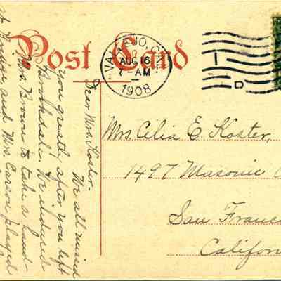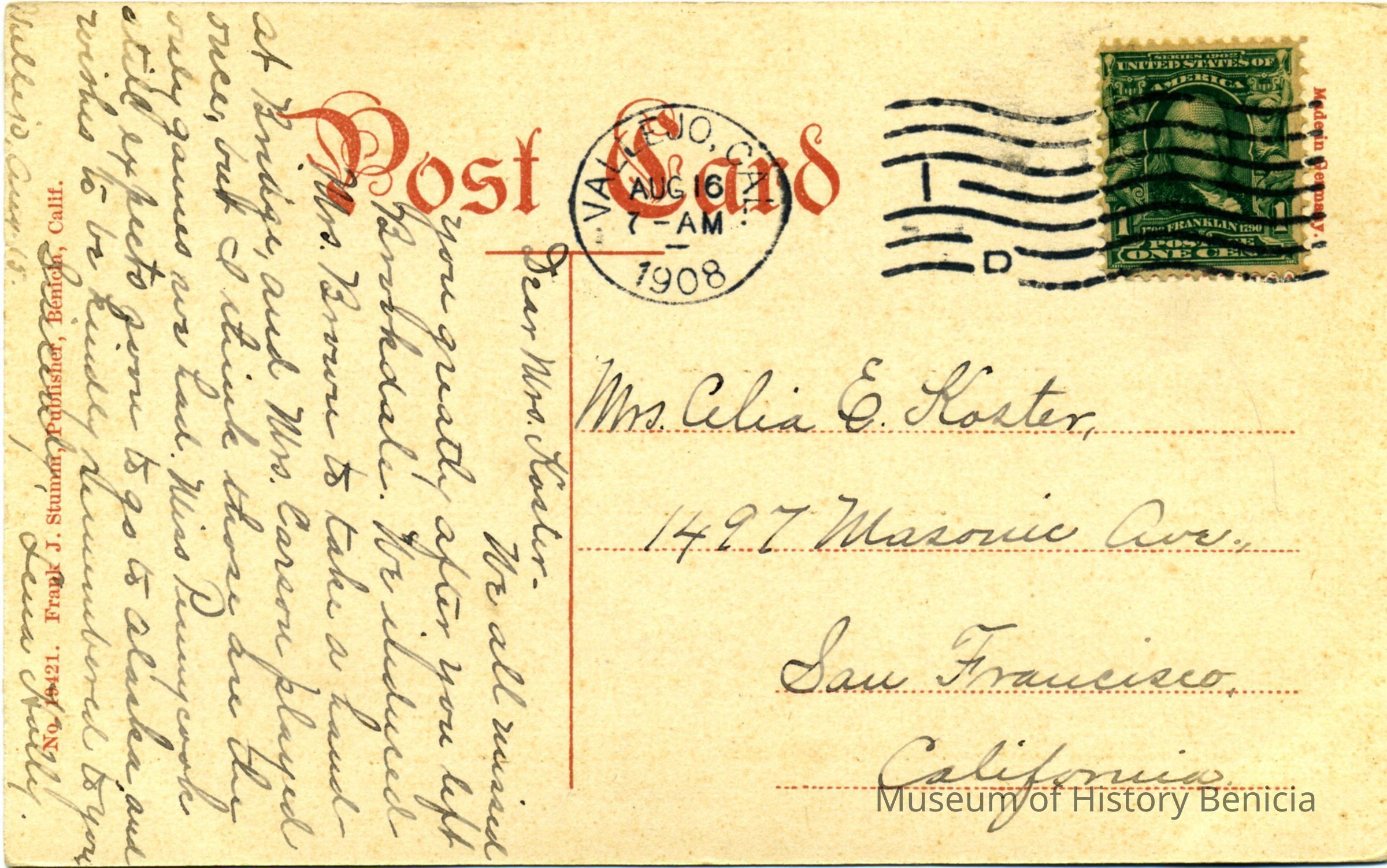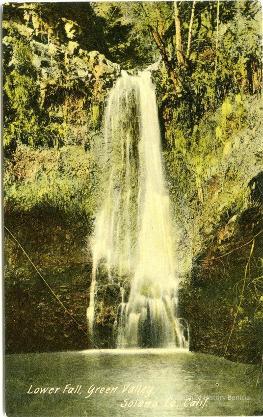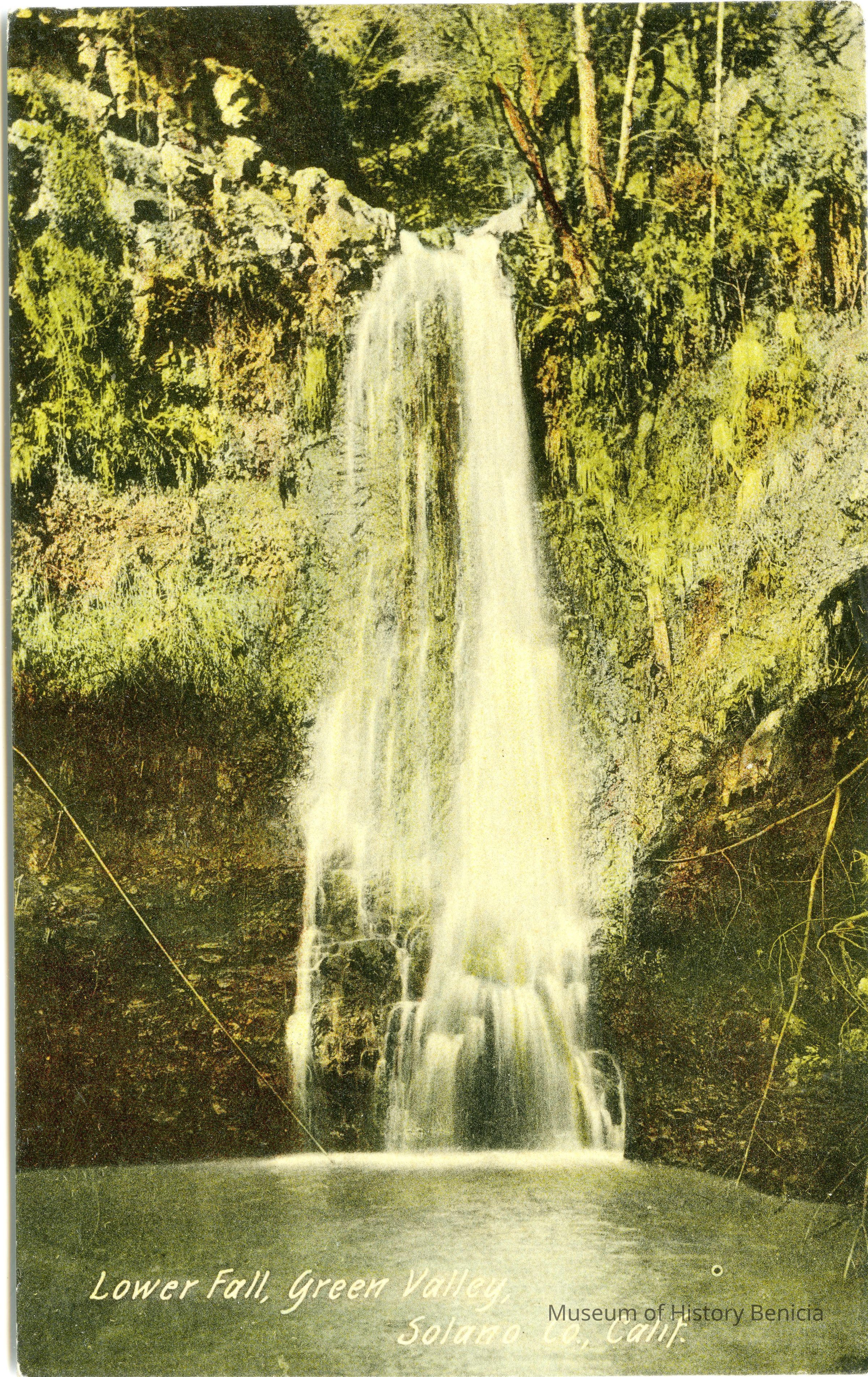 This is a divided back postcard. The photo is of Lower Falls in Green Valley. The card was published by Frank J. Stumm of Benicia, CA. The back is addressed to Mrs. Celia E. Koster of San Francisco, CA. The message is from Lena Holly of Vallejo. She is saying that they miss Mrs. Koster at "Brookdale" and have not had good luck finding Bridge players since she left Brookdale.Collection