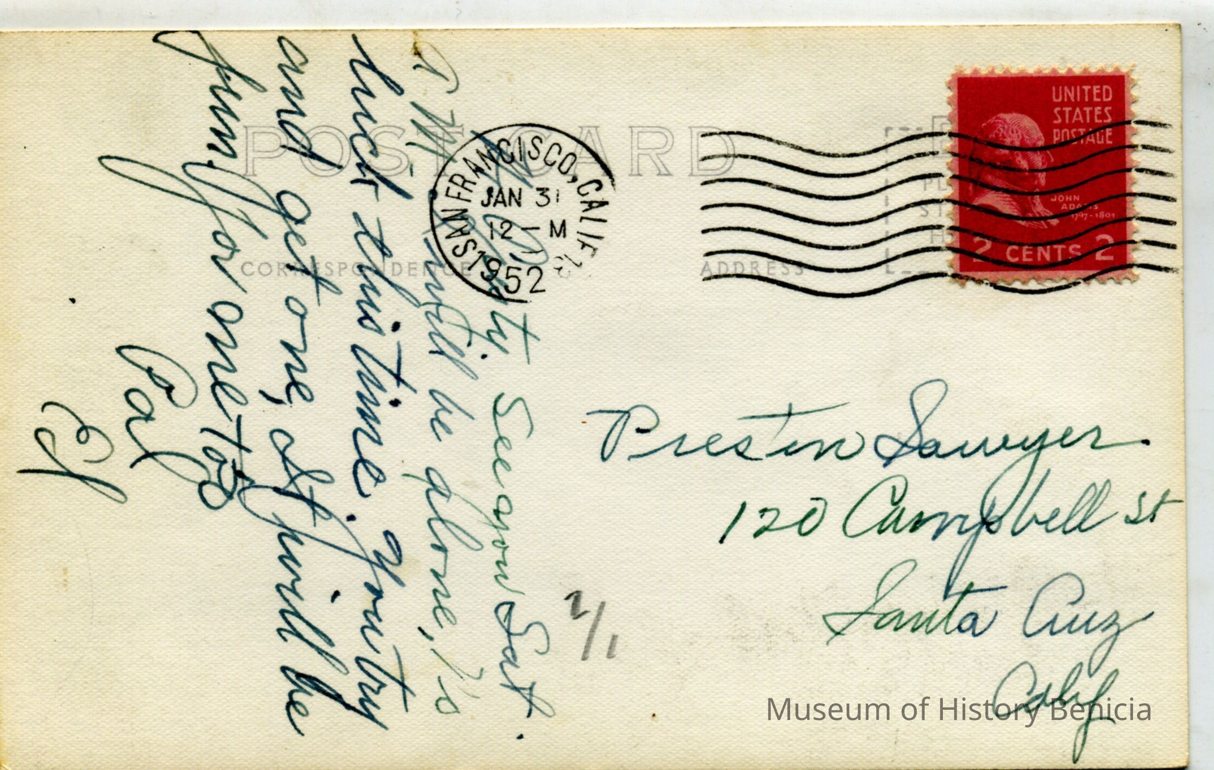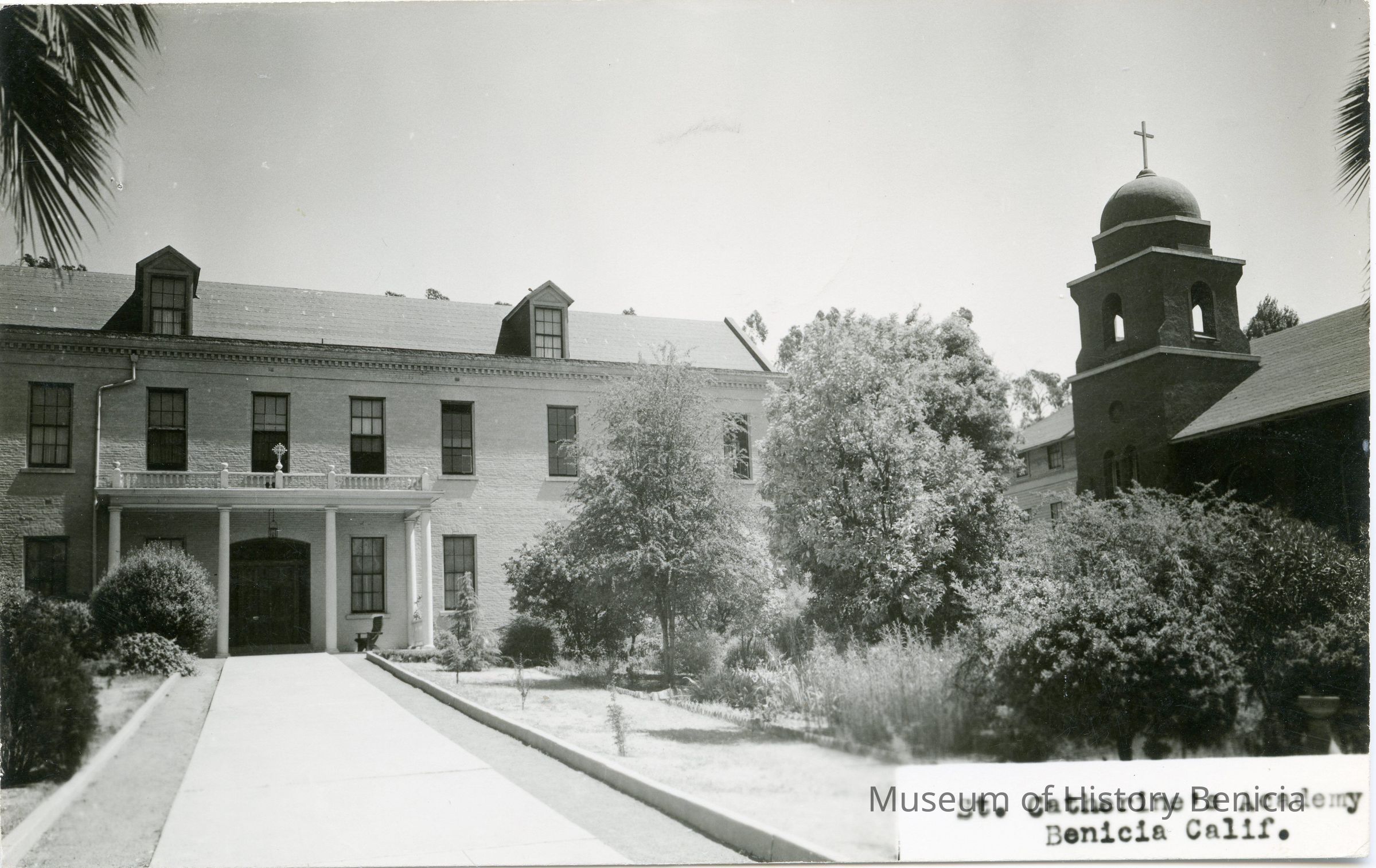 This is a divided back postcard. The photo is of St. Catherine's Academy in Benicia, CA. The card was not published by Frank J. Stumm of Benicia, CA. This is a real photo postcard. The back is addressed to Preston Sawyer of Santa Cruz, CA. The message just confirms when he will visit.Collection