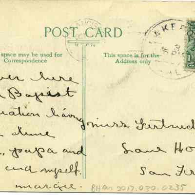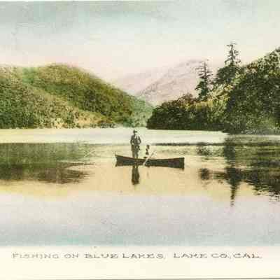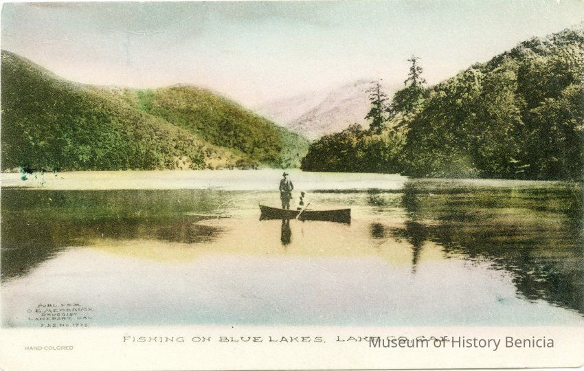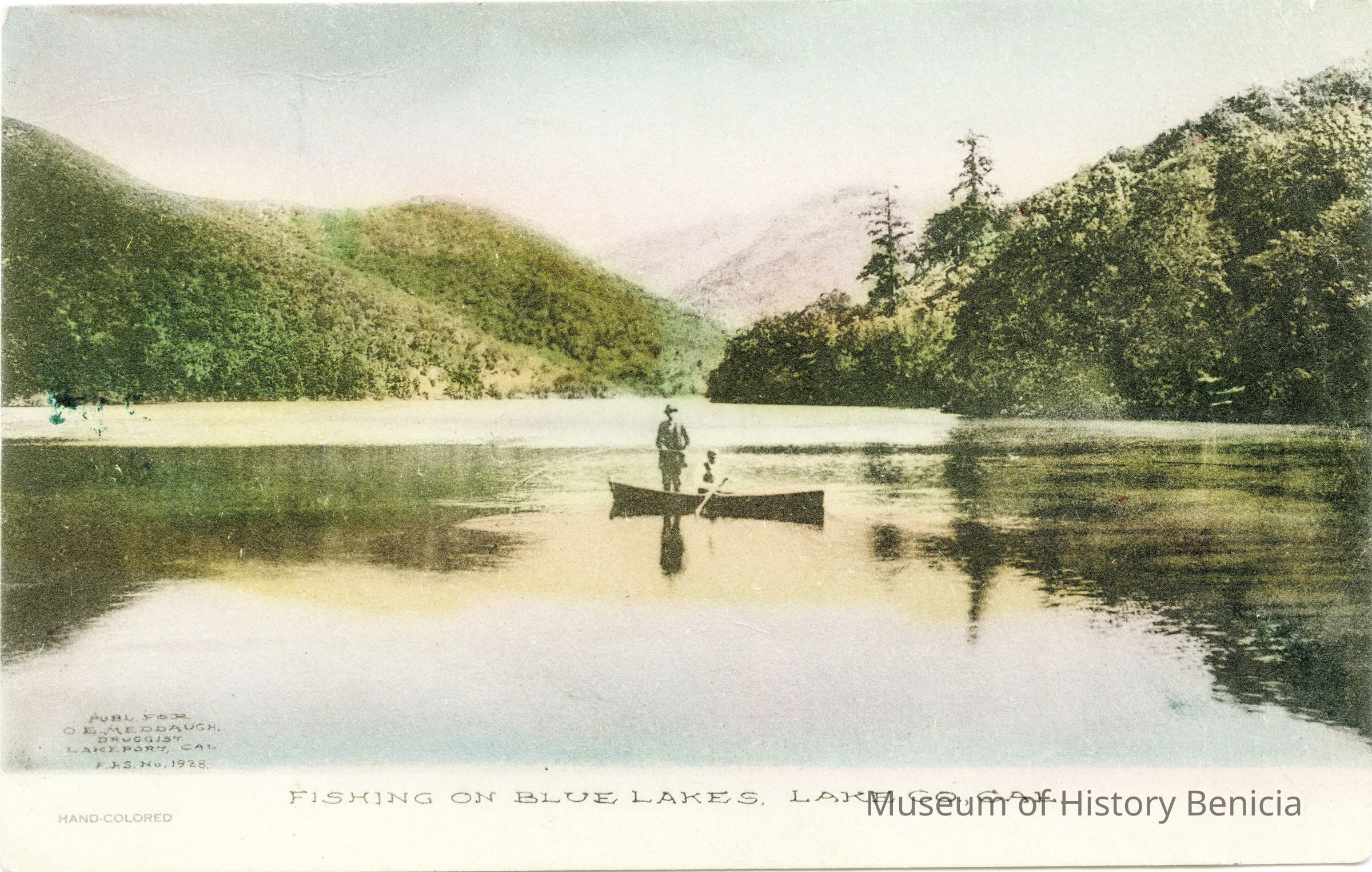 This is a divided back postcard. The photo is of fishing on Blue Lake in Lake County CA. The card is published by Frank J. Stumm of Benicia, CA for O. E. Meddaugh a druggist in Lakeport, CA. The back is addressed to Miss Gertrude Fuller of San Francisco, CA. The message just says the writter is there for a Baptist Association and having a fine time.Collection