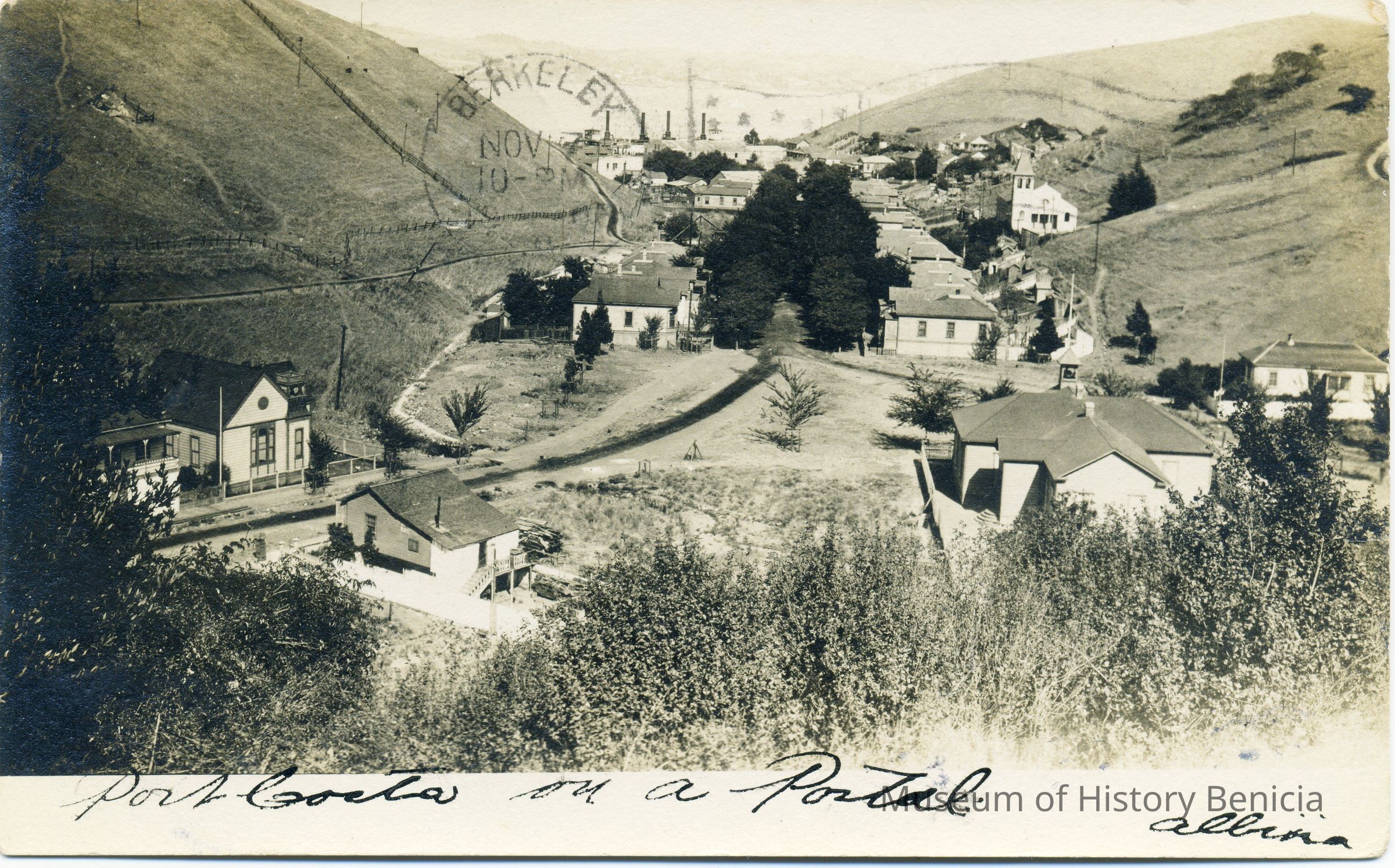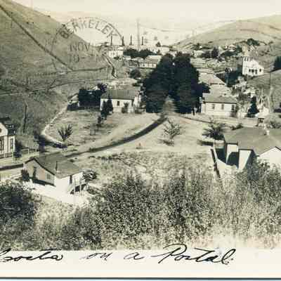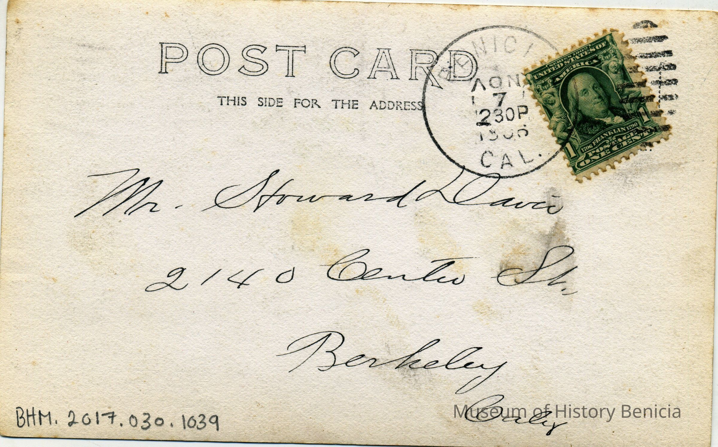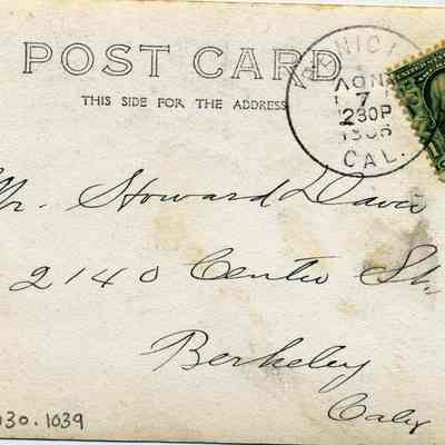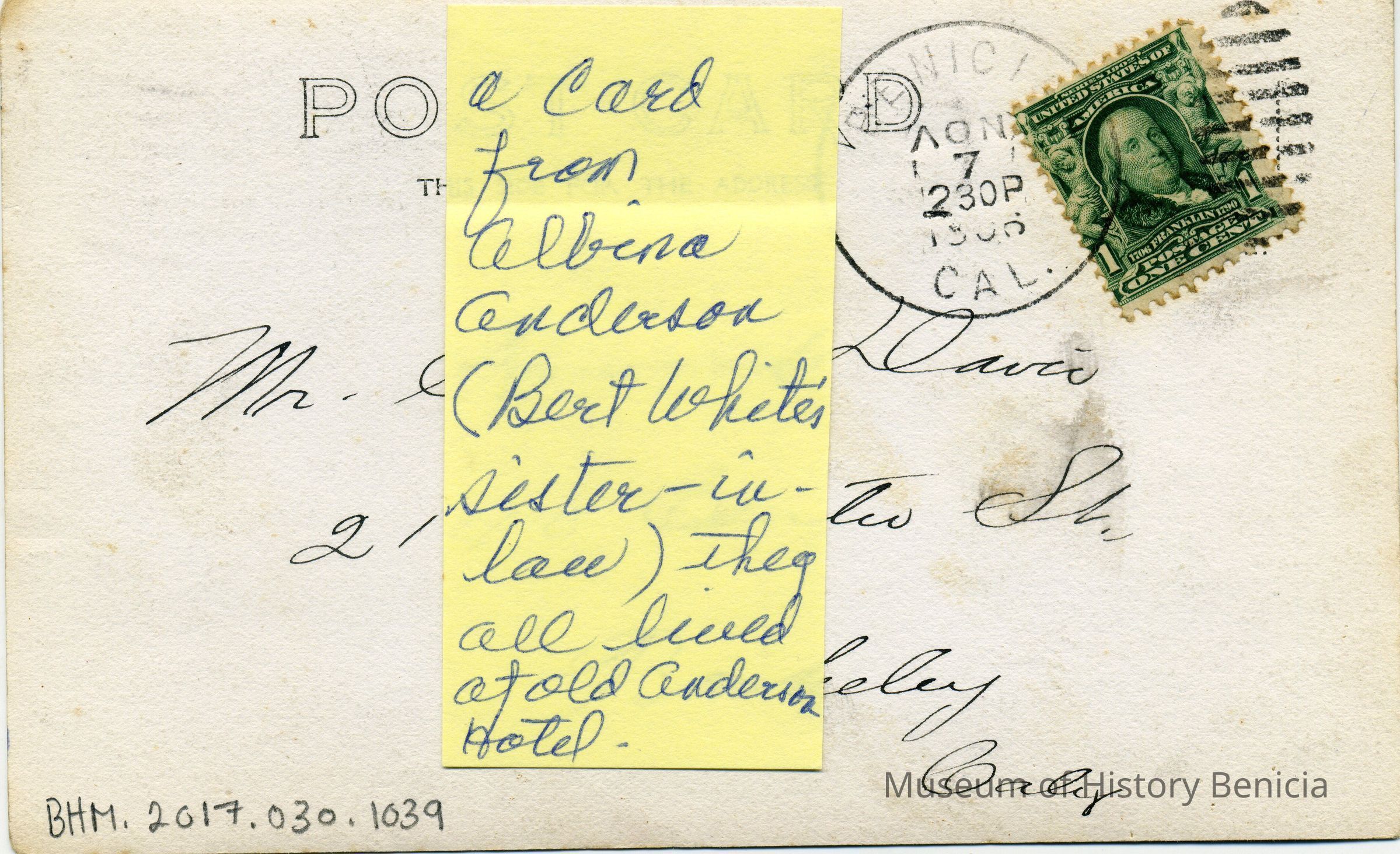 A postit on the card says that this is a card from Albina Andersoa (Bert White's Sister-in-law) They all lived at old Anderson Hotel. It is addressed to Howard Davis in Berkeley. The front just says "Port Costa on a postal".