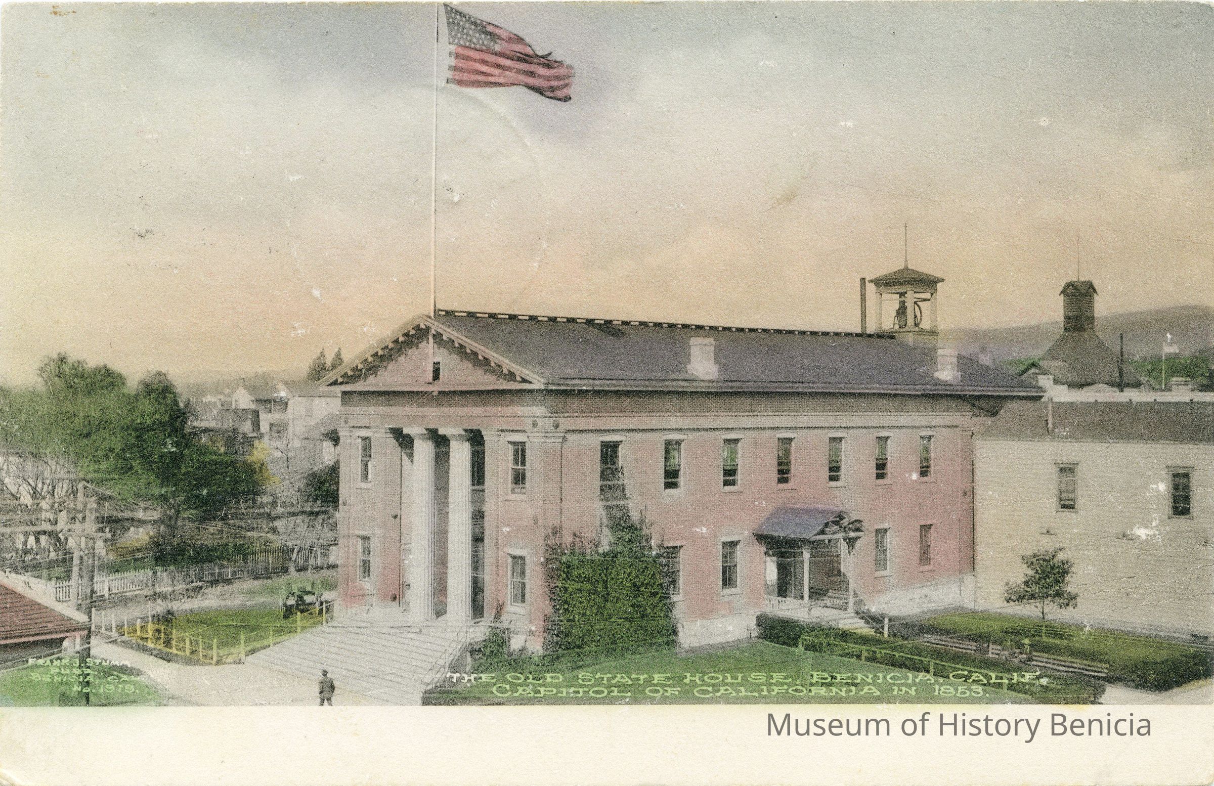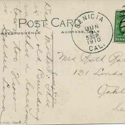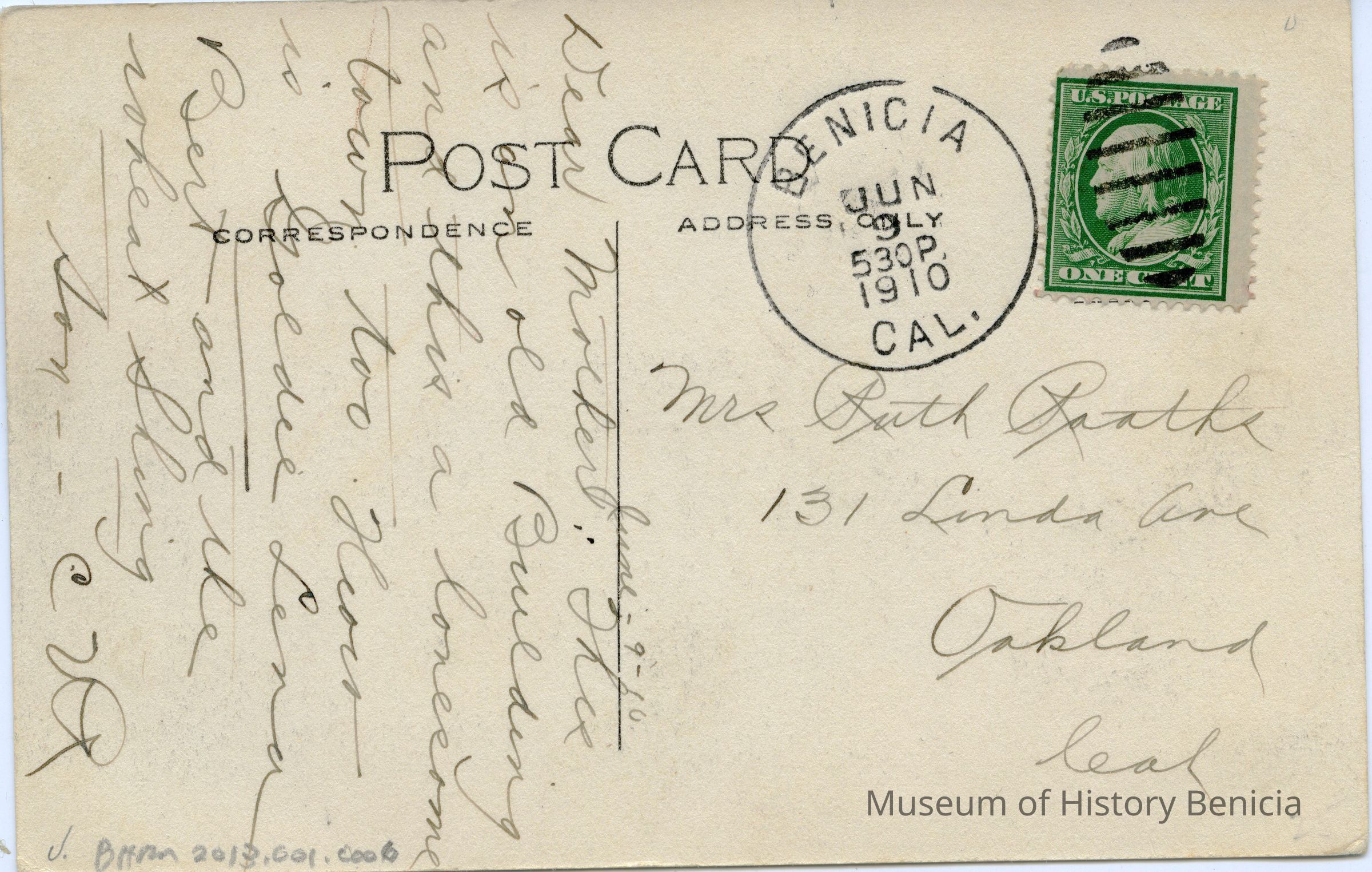 This is the postcard that is shown on the sign about "Examples of Frank Stumm postcards". It is a hand colored photo of the old State Capitol. The back is addressed to Ruth Raathe in Oakland California with a Benicia postmark. The message is:
