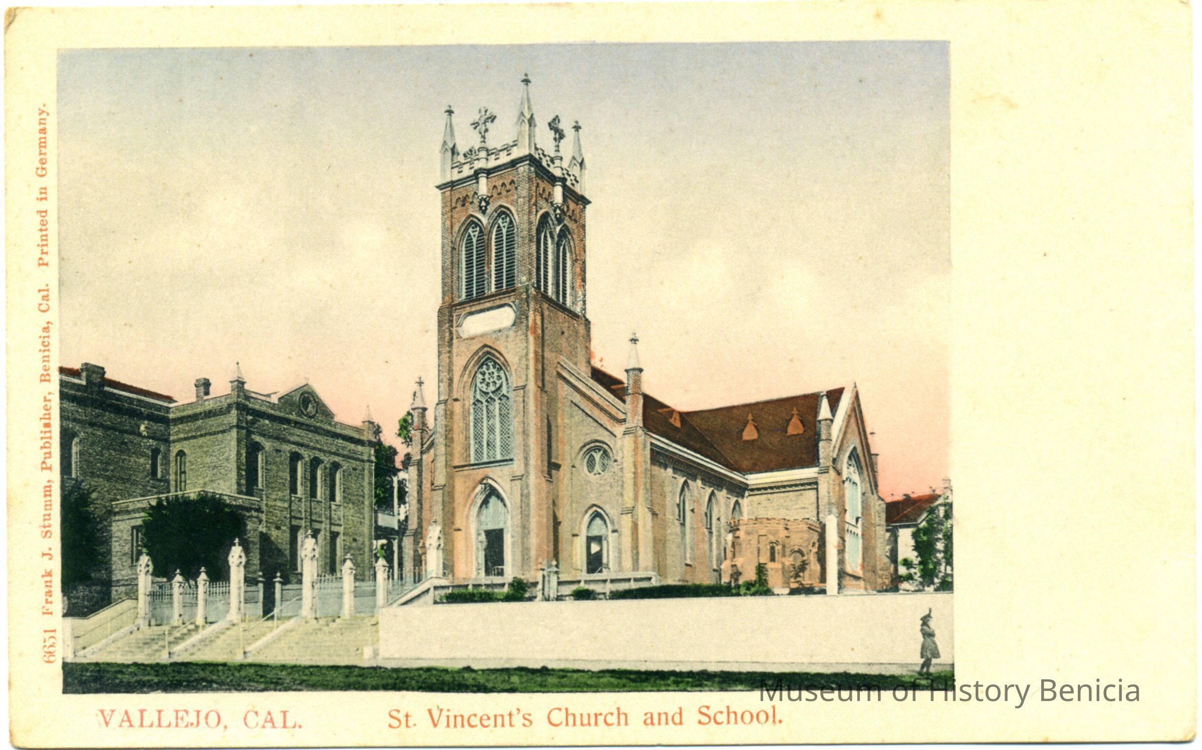 This is an address only back postcard of St. Vincent's in Vallejo.. It is marked Frank J Stumm Publisher Benicia, CA. It is a picture of the church from street level. The card has wide white borders.